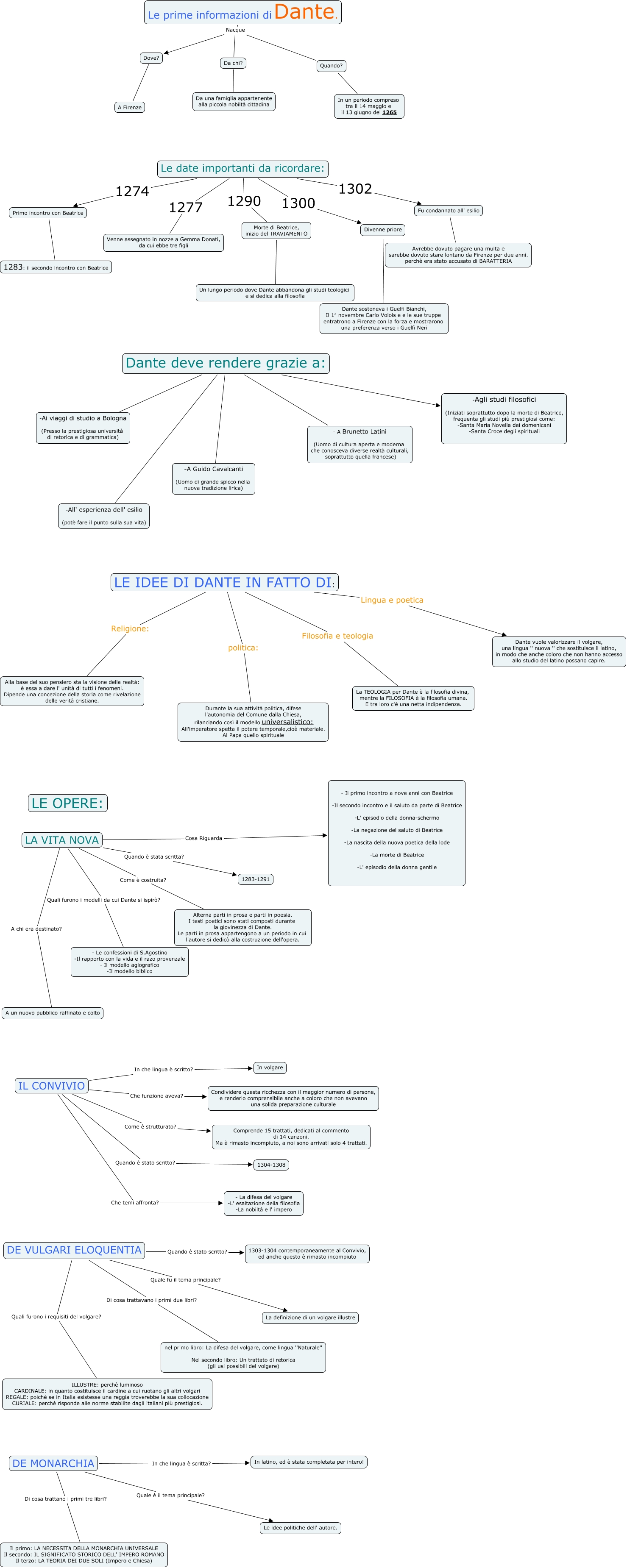 Questa Cmap, creata con IHMC CmapTools, contiene informazioni relative a: -rota-giulia-Dante.cmap, Dante deve rendere grazie a: -Ai viaggi di studio a Bologna (Presso la prestigiosa università di retorica e di grammatica), LA VITA NOVA Quali furono i modelli da cui Dante si ispirò? - Le confessioni di S.Agostino -Il rapporto con la vida e il razo provenzale - Il modello agiografico -Il modello biblico, DE MONARCHIA Quale è il tema principale? Le idee politiche dell' autore., Le prime informazioni di Dante. Nacque Dove?, Le date importanti da ricordare: 1302 Fu condannato all' esilio, IL CONVIVIO Che temi affronta? - La difesa del volgare -L' esaltazione della filosofia -La nobiltà e l' impero, Fu condannato all' esilio Avrebbe dovuto pagare una multa e sarebbe dovuto stare lontano da Firenze per due anni. perchè era stato accusato di BARATTERIA, Le date importanti da ricordare: 1277 Venne assegnato in nozze a Gemma Donati, da cui ebbe tre figli, IL CONVIVIO Come è strutturato? Comprende 15 trattati, dedicati al commento di 14 canzoni. Ma è rimasto incompiuto, a noi sono arrivati solo 4 trattati., IL CONVIVIO Quando è stato scritto? 1304-1308, Le date importanti da ricordare: 1300 Divenne priore, Dante deve rendere grazie a: - A Brunetto Latini (Uomo di cultura aperta e moderna che conosceva diverse realtà culturali, soprattutto quella francese), LE IDEE DI DANTE IN FATTO DI: Religione: Alla base del suo pensiero sta la visione della realtà: è essa a dare l' unità di tutti i fenomeni. Dipende una concezione della storia come rivelazione delle verità cristiane., Quando? In un periodo compreso tra il 14 maggio e il 13 giugno del 1265, LA VITA NOVA Quando è stata scritta? 1283-1291, Dante deve rendere grazie a: -Agli studi filosofici (Iniziati soprattutto dopo la morte di Beatrice, frequenta gli studi più prestigiosi come: -Santa Maria Novella dei domenicani -Santa Croce degli spirituali, DE VULGARI ELOQUENTIA Di cosa trattavano i primi due libri? nel primo libro: La difesa del volgare, come lingua ''Naturale'' Nel secondo libro: Un trattato di retorica (gli usi possibili del volgare), Morte di Beatrice, inizio del TRAVIAMENTO Un lungo periodo dove Dante abbandona gli studi teologici e si dedica alla filosofia, IL CONVIVIO In che lingua è scritto? In volgare, Le date importanti da ricordare: 1274 Primo incontro con Beatrice