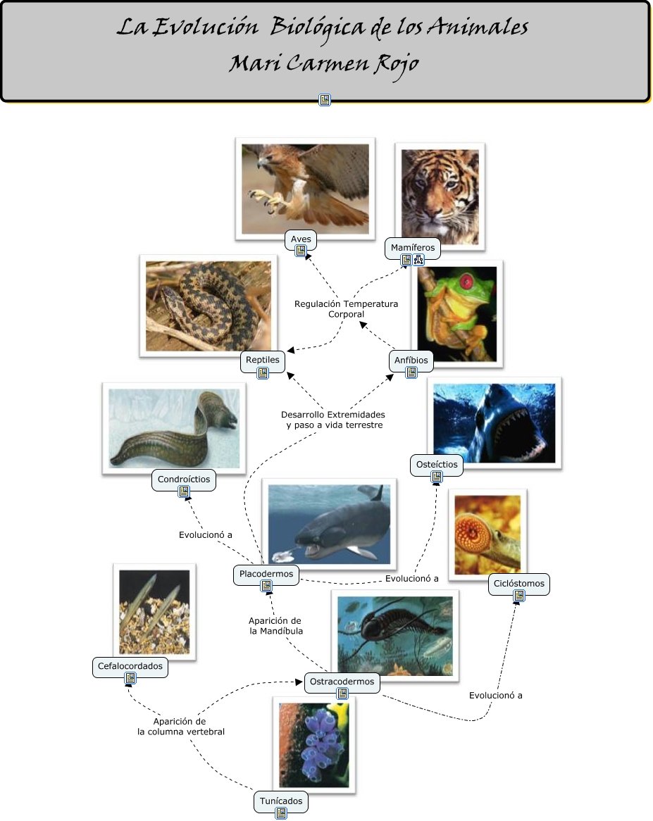 Este Cmap, tiene información relacionada con: Mapa Conceptual Evolución Biológica de los Animales, Tunícados Aparición de la columna vertebral Cefalocordados, Tunícados Aparición de la columna vertebral Ostracodermos, Ostracodermos Aparición de la Mandíbula Placodermos, Anfíbios Regulación Temperatura Corporal Mamíferos, Anfíbios Regulación Temperatura Corporal Reptiles, Ostracodermos Evolucionó a Ciclóstomos, Placodermos Evolucionó a Condroíctios, Anfíbios Regulación Temperatura Corporal Aves, Placodermos Evolucionó a Osteíctios, Placodermos Desarrollo Extremidades y paso a vida terrestre Anfíbios, Placodermos Desarrollo Extremidades y paso a vida terrestre Reptiles