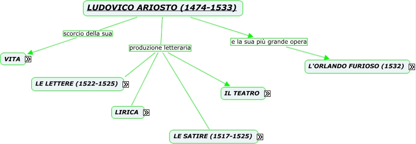 Questa Cmap, creata con IHMC CmapTools, contiene informazioni relative a: Ariosto - Pesenti Davide, PRODUZIONE LIRICA si divide in prod. volgare, LE LETTERE e le loro differenze con l'epistolario di Petrarca: -tratta di situazioni reali in modo diretto e chiaro; -conciso, preciso, le lettere di Ariosto rispecchiano l'essenzialità;, tenta un distacco, nel campo logico-narrativo, dalla purezza della forma lirica, che aveva come modello Orazio Ariosto infatti prende come modello il poeta latino ma per le sue Satire, originale rapporto con la tradizione: Ariosto, pur rispettando e valorizzando le idee di Bembo, mantiene un costante rapporto con i classici questo porta a alleggerimento e originalità nonchè una variatio dello stile Ariostesco, L'ORLANDO FURIOSO (1532) tema -ricerca: tutti cercano qualcosa all'interno della storia. Spesso non trovano l'oggetto dei loro desideri;, medio, diretto (tipico di Ariosto) con sfumature ironiche, senza però sfociare nel grottesco e nemmeno, all'opposto, nel tragico; e quindi distacco dalla forma canonizzata e ormai troppo svalutata;, -rapporto fortuna/ingegno: ispirandosi alla tradizione Boccacciana, Ariosto, intellettuale rinascimentale, pone una grande attenzione alle vicende affrontate dai personaggi, lasciando come unica "soluzione" l'utilizzo dell' ingegno; ovvero razionalità: cadute le paure e i timori di un' epoca all'isegna del timore di Dio, ecco che l'uomo acquista una sua autonomia di pensiero e una dinamicità; rivalutazione del terreno;, L'ORLANDO FURIOSO (1532) filoni -guerra contro i cristiani, condotta da Carlo Magno;, LUDOVICO ARIOSTO (1474-1533) produzione letteraria LE LETTERE (1522-1525), L'ORLANDO FURIOSO (1532) filoni -tema encomiastico: amore di Ruggero per Bradamante;, 1532: terza edizione di 46 canti; perchè? revisione lessico e maggior fedeltà alla lingua toscana;, L'ORLANDO FURIOSO (1532) intento edonistico: Ariosto vuole divertire il pubblico cortigiano e quindi colto;, L'ORLANDO FURIOSO (1532) linguaggio medio, diretto (tipico di Ariosto) con sfumature ironiche, senza però sfociare nel grottesco e nemmeno, all'opposto, nel tragico;, prod. volgare caratteristiche sensibili al modello petrarchesco, "pubblicizzato" anche dall'amico Bembo, IL TEATRO Ariosto tenta di innalzare il decoro letterario mantenendo vivacita, immediatezza ma soprattutto spontaneità, L'ORLANDO FURIOSO (1532) tema -Donna: sempre trovando come spunto Boccaccio, la donna non è più il mezzo per raggiungere il divino, il mezzo con cui sviluppare quell'ascesi spirituale che aveva caratterizzato la letteratura Medievale;, metrica: Ariosto riprende la terzina Dantesca in onore di quella libertà ed originalità che ha caratterizzato le sue opere minori; infatti non ricorre ad un'intensificazione dello stile dantesco ma ne sfrutta la colloquialità diretta;, LE SATIRE (1517-1525) caratteristiche vengono composte dopo l'Orlando Furioso, nasce nel 1474 a Reggio Emilia da famiglia nobile fino al 1494 si trasferisce continuamente con la famiglia; si avvierà poi agli studi umanistici, nasce nel 1474 a Reggio Emilia da famiglia nobile infatti il padre è alle dipendenze del duca Ercole I