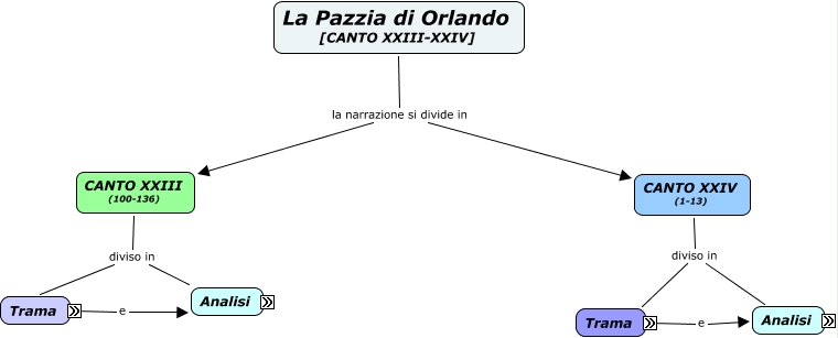 Questa Cmap, creata con IHMC CmapTools, contiene informazioni relative a: Pesenti D.-La Pazzia di Orlando, TEMA: Amore come sorgente di dolore "quante letter son, tanti son chiodi coi quali Amore il cor gli punge e fiede" Orlando è vicino alla disperazione, comportamenti Animaleschi come mangiare tutto ciò che gli capita, Pastori, spaventati dai rumori vedono la Furia e la Pazzia di Orlando, CANTO XXIV (1-13) diviso in Analisi, Pastore e della sua famiglia che, raccontando la novella Amorosa, causa la Pazzia, Amanti a cui non vuole credere Orlando, TEMA:Ironia e abbassamento livello epico "...et altritanti andar da basso ad alto, per fare al pazzo un villanesco assalto" Nell'Orlando Furioso non c'è più l'innalzamento epico e nobile dei personaggi., Trama e Analisi, Angelica e Medoro che sono Amanti, TEMA: Lealtà ed Onore appartiene al Ciclo Carolingio, Orlando e quindi alla del Pastore e della sua famiglia, Ariosto, soffermandosi sul destino dei malcapitati fa due ipotesi: ovvero è a loro sfavorevole il destino, Attaccare Orlando in qualche modo ma la sua Ira è Devastante e Potente, TEMA:Ragione fragile davanti alle passioni "e quale è di pazzia segno più espresso che, per altri voler, perder se stesso?" L'Amore viene paragonato ad una trappola per uccelli, dove più cerchi di uscirne, più ti trovi invischiato, TEMA:Ironia e abbassamento livello epico "in terra un paio addormentato stese ch' al novissimo dì forse fia desto" essendo privato di ogni connotato divino e provvidenzialistico il riferimento al giorno del Giudizio non può che essere ironico, 2) qualcuno vuole diffamare la sua Amata imitandone la Scrittura poichè Orlando è vicino alla disperazione, vengono fatti a pezzi mentre i rimanenti (che) fuggono, La Pazzia di Orlando [CANTO XXIII-XXIV] la narrazione si divide in CANTO XXIII (100-136), CANTO XXIII (100-136) diviso in Analisi, TEMA: Lealtà ed Onore lo troviamo ai versi "1,2,3" stanza n°100