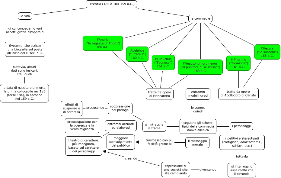 Questa Cmap, creata con IHMC CmapTools, contiene informazioni relative a: Terenzio-Gaia Mazzoleni, tratte da opere di Meneandro entrambi modelli greci, il messaggio morale trasmesso con più facilità grazie al maggiore coinvolgimento del pubblico, Terenzio (185 o 184-159 a.C.) la vita, l'Hecyra ("la suocera") 165 a.C. tratte da opere di Apollodoro di Caristo, seguono gli schemi tipici della commedia nuova ellenica il messaggio morale, l'Andria ("la ragazza di Andro") 166 a.C. tratte da opere di Meneandro, i personaggi ripetitivi e stereotipati (cortigiane, adulescentes, schiavi, ecc.), Svetonio, che scrisse una biografia sul poeta all'inizio del II sec. d.C. tuttavia, alcuni dati sono insicuri, fra i quali la data di nascita e di morte, la prima collocabile nel 185 (forse 184), la seconda nel 159 a.C., ripetitivi e stereotipati (cortigiane, adulescentes, schiavi, ecc.) tuttavia si interrogano sulla realtà che li circonda, l'Heautontimorumenos ("il punitore di se stesso") 163 a.C. tratte da opere di Meneandro, le commedie l'Andria ("la ragazza di Andro") 166 a.C., seguono gli schemi tipici della commedia nuova ellenica gli intrecci e le trame, soppressione del prologo producendo effetti di suspense e di sorpresa, Terenzio (185 o 184-159 a.C.) le commedie, le commedie l'Heautontimorumenos ("il punitore di se stesso") 163 a.C., tratte da opere di Apollodoro di Caristo entrambi modelli greci, seguono gli schemi tipici della commedia nuova ellenica i personaggi, la vita di cui conosciamo vari aspetti grazie all'opera di Svetonio, che scrisse una biografia sul poeta all'inizio del II sec. d.C., le commedie Adelphoe ("i fratelli") 160 a.C., gli intrecci e le trame entrambi accurati ed elaborati