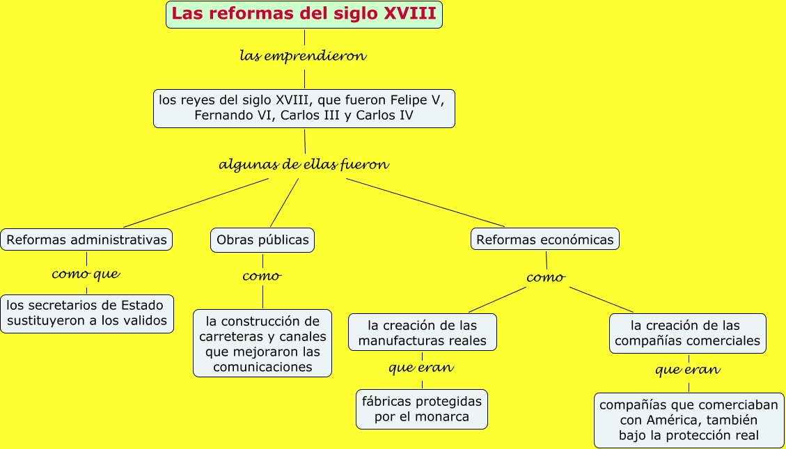 Este Cmap, tiene información relacionada con: Las reformas del siglo XVIII, los reyes del siglo XVIII, que fueron Felipe V, Fernando VI, Carlos III y Carlos IV algunas de ellas fueron Reformas económicas, Reformas económicas como la creación de las compañías comerciales, Reformas económicas como la creación de las manufacturas reales, los reyes del siglo XVIII, que fueron Felipe V, Fernando VI, Carlos III y Carlos IV algunas de ellas fueron Obras públicas, la creación de las compañías comerciales que eran compañías que comerciaban con América, también bajo la protección real, los reyes del siglo XVIII, que fueron Felipe V, Fernando VI, Carlos III y Carlos IV algunas de ellas fueron Reformas administrativas, la creación de las manufacturas reales que eran fábricas protegidas por el monarca, Las reformas del siglo XVIII las emprendieron los reyes del siglo XVIII, que fueron Felipe V, Fernando VI, Carlos III y Carlos IV, Reformas administrativas como que los secretarios de Estado sustituyeron a los validos, Obras públicas como la construcción de carreteras y canales que mejoraron las comunicaciones