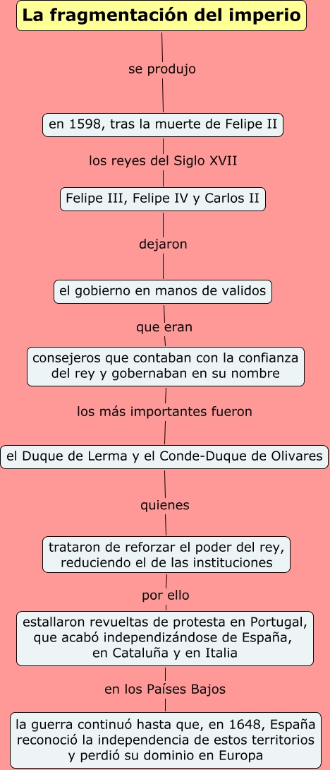 Este Cmap, tiene información relacionada con: La fragmentación del imperio español, trataron de reforzar el poder del rey, reduciendo el de las instituciones por ello estallaron revueltas de protesta en Portugal, que acabó independizándose de España, en Cataluña y en Italia, el Duque de Lerma y el Conde-Duque de Olivares quienes trataron de reforzar el poder del rey, reduciendo el de las instituciones, estallaron revueltas de protesta en Portugal, que acabó independizándose de España, en Cataluña y en Italia en los Países Bajos la guerra continuó hasta que, en 1648, España reconoció la independencia de estos territorios y perdió su dominio en Europa, el gobierno en manos de validos que eran consejeros que contaban con la confianza del rey y gobernaban en su nombre, La fragmentación del imperio se produjo en 1598, tras la muerte de Felipe II, consejeros que contaban con la confianza del rey y gobernaban en su nombre los más importantes fueron el Duque de Lerma y el Conde-Duque de Olivares, Felipe III, Felipe IV y Carlos II dejaron el gobierno en manos de validos, en 1598, tras la muerte de Felipe II los reyes del Siglo XVII Felipe III, Felipe IV y Carlos II