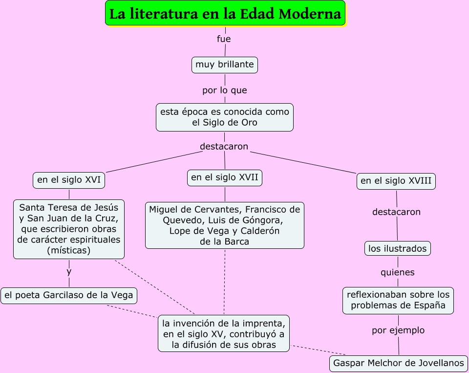 Este Cmap, tiene información relacionada con: La literatura en la Edad Moderna, Santa Teresa de Jesús y San Juan de la Cruz, que escribieron obras de carácter espirituales (místicas) y el poeta Garcilaso de la Vega, en el siglo XVIII destacaron los ilustrados, esta época es conocida como el Siglo de Oro destacaron en el siglo XVII, los ilustrados quienes reflexionaban sobre los problemas de España, el poeta Garcilaso de la Vega la invención de la imprenta, en el siglo XV, contribuyó a la difusión de sus obras, Gaspar Melchor de Jovellanos la invención de la imprenta, en el siglo XV, contribuyó a la difusión de sus obras, reflexionaban sobre los problemas de España por ejemplo Gaspar Melchor de Jovellanos, esta época es conocida como el Siglo de Oro destacaron en el siglo XVIII, en el siglo XVI Santa Teresa de Jesús y San Juan de la Cruz, que escribieron obras de carácter espirituales (místicas), en el siglo XVII Miguel de Cervantes, Francisco de Quevedo, Luis de Góngora, Lope de Vega y Calderón de la Barca, muy brillante por lo que esta época es conocida como el Siglo de Oro, Santa Teresa de Jesús y San Juan de la Cruz, que escribieron obras de carácter espirituales (místicas) la invención de la imprenta, en el siglo XV, contribuyó a la difusión de sus obras, Miguel de Cervantes, Francisco de Quevedo, Luis de Góngora, Lope de Vega y Calderón de la Barca la invención de la imprenta, en el siglo XV, contribuyó a la difusión de sus obras, esta época es conocida como el Siglo de Oro destacaron en el siglo XVI, La literatura en la Edad Moderna fue muy brillante