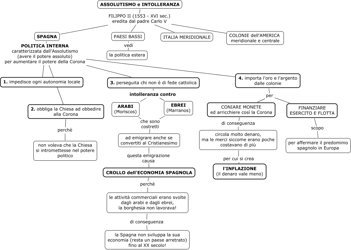 Questa Cmap, creata con IHMC CmapTools, contiene informazioni relative a: Assolutismo Filippo II, circola molto denaro, ma le merci siccome erano poche costavano di più per cui si crea l'INFLAZIONE (il denaro vale meno), SPAGNA POLITICA INTERNA caratterizzata dall'Assolutismo (avere il potere assoluto) per aumentare il potere della Corona 3. perseguita chi non è di fede cattolica, 4. importa l'oro e l'argento dalle colonie per CONIARE MONETE ed arricchiere così la Corona, le attività commerciali erano svolte dagli arabi e dagli ebrei, la borghesia non lavorava! di conseguenza la Spagna non sviluppa la sua economia (resta un paese arretrato) fino al XX secolo!, ASSOLUTISMO e INTOLLERANZA FILIPPO II (1553 - XVI sec.) eredita dal padre Carlo V ITALIA MERIDIONALE, ARABI (Moriscos) che sono costretti ad emigrare anche se convertiti al Cristianesimo, SPAGNA POLITICA INTERNA caratterizzata dall'Assolutismo (avere il potere assoluto) per aumentare il potere della Corona 1. impedisce ogni autonomia locale, ASSOLUTISMO e INTOLLERANZA FILIPPO II (1553 - XVI sec.) eredita dal padre Carlo V PAESI BASSI, CROLLO dell'ECONOMIA SPAGNOLA perchè le attività commerciali erano svolte dagli arabi e dagli ebrei, la borghesia non lavorava!, 3. perseguita chi non è di fede cattolica intolleranza contro ARABI (Moriscos), PAESI BASSI vedi la politica estera, 3. perseguita chi non è di fede cattolica intolleranza contro EBREI (Marranos), CONIARE MONETE ed arricchiere così la Corona di conseguenza circola molto denaro, ma le merci siccome erano poche costavano di più, 2. obbliga la Chiesa ad obbedire alla Corona perchè non voleva che la Chiesa si intromettesse nel potere politico, 4. importa l'oro e l'argento dalle colonie per FINANZIARE ESERCITO E FLOTTA, ASSOLUTISMO e INTOLLERANZA FILIPPO II (1553 - XVI sec.) eredita dal padre Carlo V SPAGNA, ASSOLUTISMO e INTOLLERANZA FILIPPO II (1553 - XVI sec.) eredita dal padre Carlo V COLONIE dell'AMERICA meridionale e centrale, SPAGNA POLITICA INTERNA caratterizzata dall'Assolutismo (avere il potere assoluto) per aumentare il potere della Corona 4. importa l'oro e l'argento dalle colonie, ad emigrare anche se convertiti al Cristianesimo questa emigrazione causa CROLLO dell'ECONOMIA SPAGNOLA, FINANZIARE ESERCITO E FLOTTA scopo per affermare il predominio spagnolo in Europa