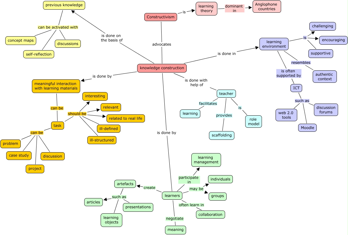 This Concept Map, created with IHMC CmapTools, has information related to: Constructivism, meaningful interaction with learning materials can be task, Constructivism advocates knowledge construction, knowledge construction is done in learning environment, task should be ill-defined, knowledge construction is done by meaningful interaction with learning materials, previous knowledge can be activated with self-reflection, knowledge construction is done with help of teacher, task can be case study, learning environment is supportive, task should be relevant, artefacts such as learning objects, artefacts such as articles, learners participate in learning management, learning environment is often supported by ICT, teacher provides scaffolding, learners often learn in collaboration, learning environment is challenging, previous knowledge can be activated with concept maps, learning environment resembles authentic context, teacher facilitates learning