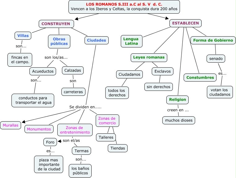 Este Cmap, tiene información relacionada con: Los romanos, ESTABLECEN ???? Religion, Obras públicas son los/as... Calzadas, Ciudades Se dividen en..... Murallas, LOS ROMANOS S.III a.C al S. V d. C. Vencen a los Iberos y Celtas, la conquista dura 200 años ???? CONSTRUYEN, Zonas de comercio ???? Tiendas, senado es... votan los ciudadanos, Ciudades Se dividen en..... Zonas de comercio, Obras públicas son los/as... Acueductos, Zonas de comercio ???? Talleres, ESTABLECEN ???? Constumbres, CONSTRUYEN ???? Villas, Forma de Gobierno ???? senado, ESTABLECEN ???? Lengua Latina, LOS ROMANOS S.III a.C al S. V d. C. Vencen a los Iberos y Celtas, la conquista dura 200 años ???? ESTABLECEN, CONSTRUYEN ???? Obras públicas, Leyes romanas ???? Exclavos, Foro es... plaza mas importante de la ciudad, Ciudadanos ???? todos los derechos, Zonas de entretenimiento son el/as Foro, Termas son... los baños públicos