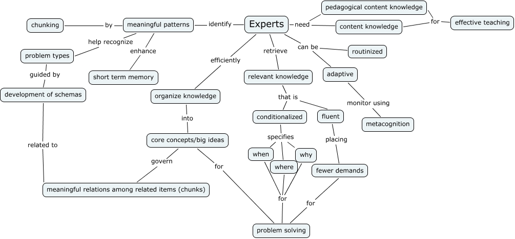 This Concept Map, created with IHMC CmapTools, has information related to: Chapter 2, Experts identify meaningful patterns, meaningful patterns help recognize problem types, Experts need pedagogical content knowledge, Experts can be routinized, development of schemas related to meaningful relations among related items (chunks), Experts can be adaptive, problem solving for fewer demands, relevant knowledge that is fluent, core concepts/big ideas for problem solving, fluent placing fewer demands, problem solving for when, Experts efficiently organize knowledge, problem types guided by development of schemas, conditionalized specifies why, meaningful patterns by chunking, effective teaching for content knowledge, conditionalized specifies where, adaptive monitor using metacognition, organize knowledge into core concepts/big ideas, problem solving for why