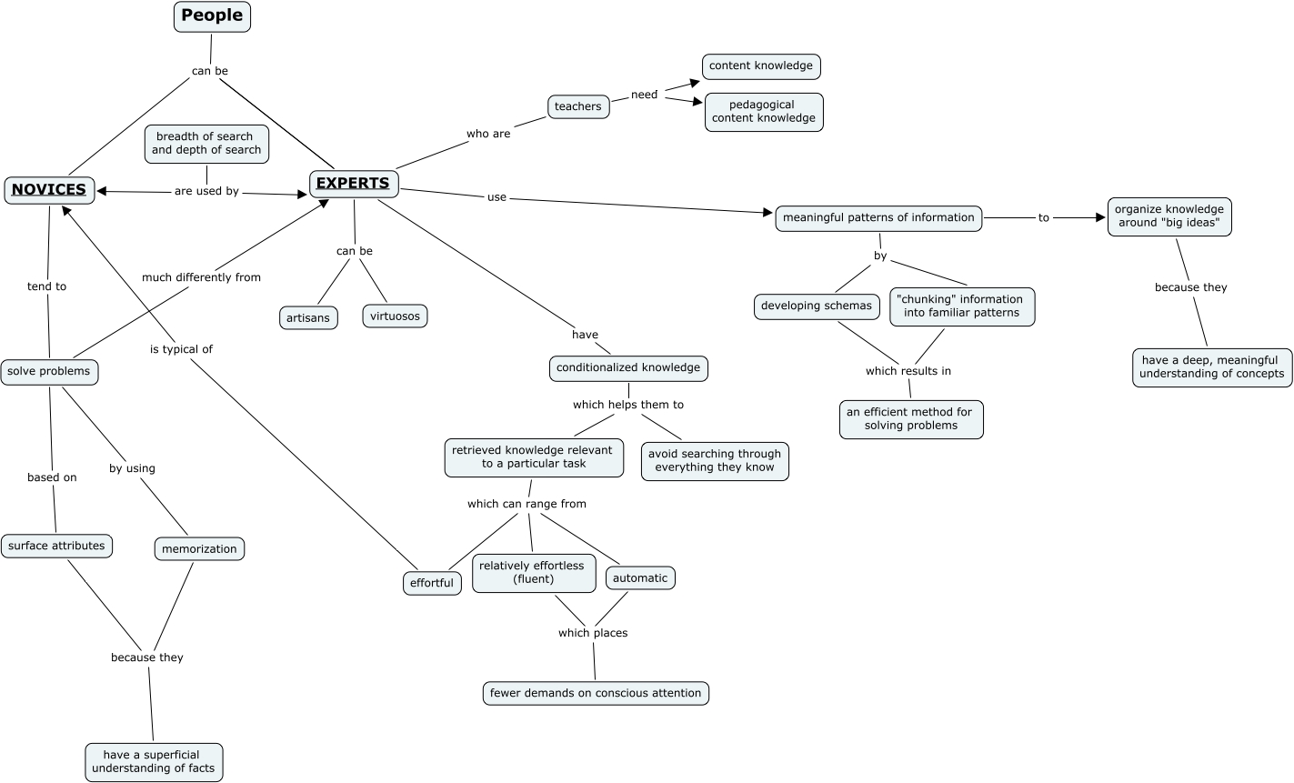 This Concept Map, created with IHMC CmapTools, has information related to: Practice CMap, conditionalized knowledge which helps them to avoid searching through everything they know, solve problems much differently from EXPERTS, teachers need content knowledge, automatic which can range from relatively effortless (fluent), effortful is typical of NOVICES, "chunking" information into familiar patterns which results in an efficient method for solving problems, retrieved knowledge relevant to a particular task which can range from relatively effortless (fluent), automatic which places fewer demands on conscious attention, developing schemas which results in an efficient method for solving problems, meaningful patterns of information to organize knowledge around "big ideas", solve problems based on surface attributes, effortful which can range from relatively effortless (fluent), breadth of search and depth of search are used by NOVICES, People can be EXPERTS, EXPERTS can be virtuosos, conditionalized knowledge which helps them to retrieved knowledge relevant to a particular task, surface attributes because they have a superficial understanding of facts, NOVICES can be EXPERTS, EXPERTS use meaningful patterns of information, NOVICES tend to solve problems