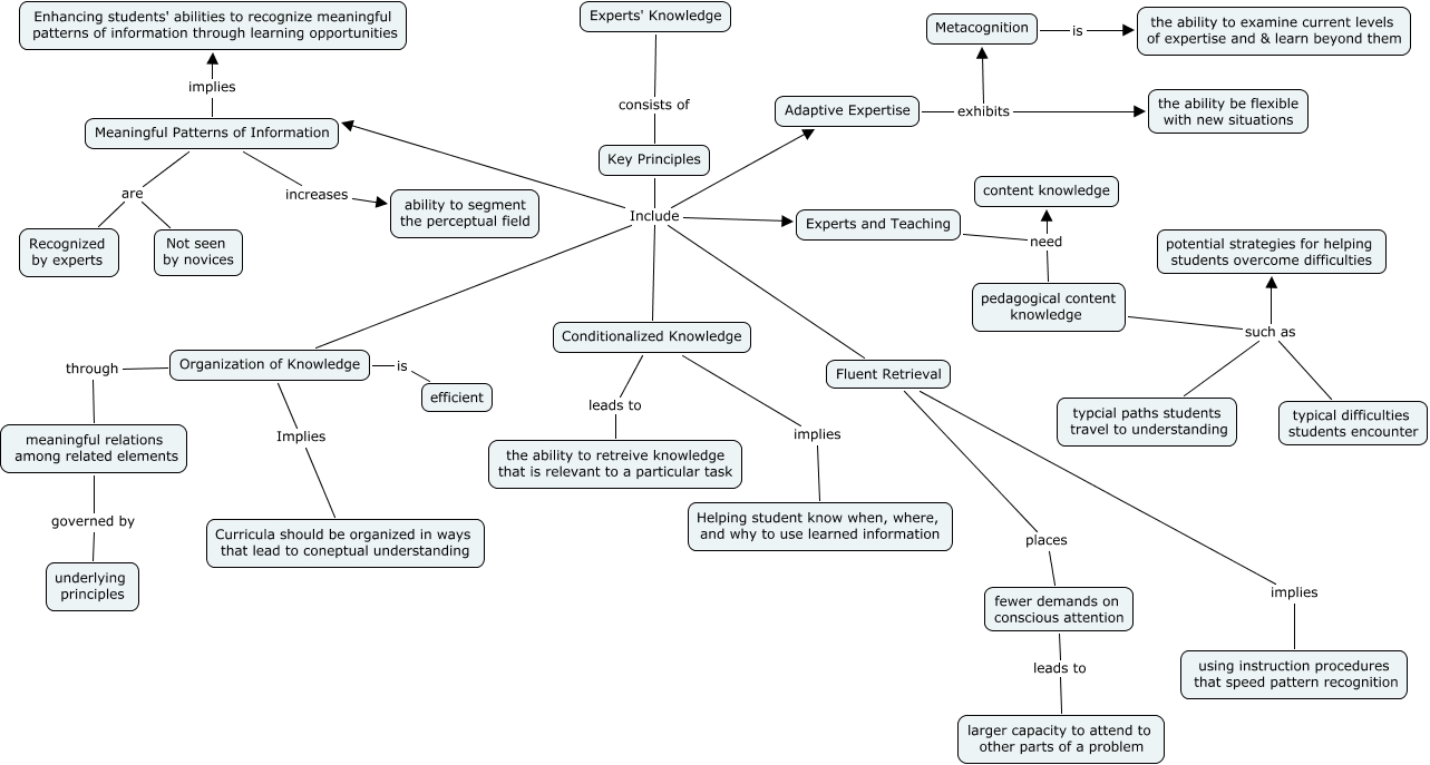 This Concept Map, created with IHMC CmapTools, has information related to: HPL Chapter 2, Adaptive Expertise exhibits the ability be flexible with new situations, Key Principles Include Adaptive Expertise, Organization of Knowledge is efficient, Metacognition is the ability to examine current levels of expertise and & learn beyond them, Organization of Knowledge Implies Curricula should be organized in ways that lead to coneptual understanding, Meaningful Patterns of Information increases ability to segment the perceptual field, Fluent Retrieval implies using instruction procedures that speed pattern recognition, Experts' Knowledge consists of Key Principles, Meaningful Patterns of Information implies Enhancing students' abilities to recognize meaningful patterns of information through learning opportunities, meaningful relations among related elements governed by underlying principles, Key Principles Include Fluent Retrieval, Experts and Teaching need pedagogical content knowledge, Key Principles Include Meaningful Patterns of Information, Conditionalized Knowledge implies Helping student know when, where, and why to use learned information, Meaningful Patterns of Information are Not seen by novices, Key Principles Include Organization of Knowledge, Adaptive Expertise exhibits Metacognition, Key Principles Include Experts and Teaching, Experts and Teaching need content knowledge, pedagogical content knowledge such as potential strategies for helping students overcome difficulties