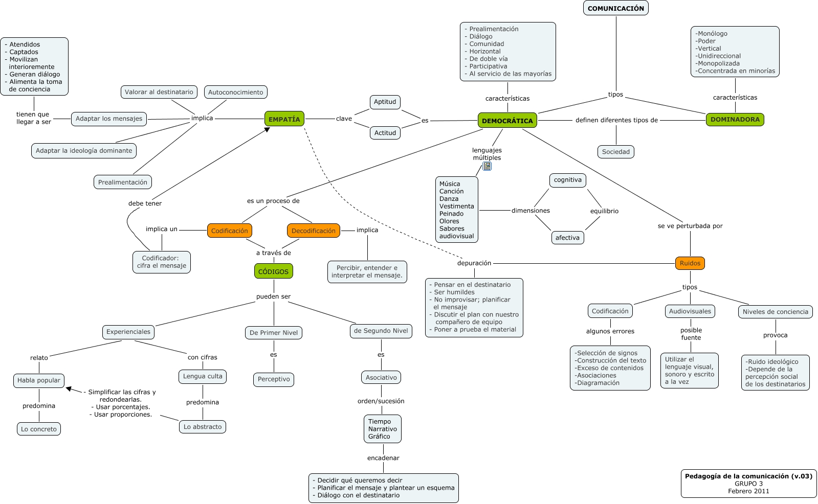 Este mapa conceptual ten información relativa a: Pedagogía de la Comunicación - M. Kaplún, DEMOCRÁTICA es un proceso de Decodificación, Ruidos tipos Audiovisuales, Tiempo Narrativo Gráfico orden/sucesión Asociativo, Habla popular predomina Lo concreto, Experienciales con cifras Lengua culta, Lo abstracto - Simplificar las cifras y redondearlas. - Usar porcentajes. - Usar proporciones. Habla popular, EMPATÍA implica Adaptar la ideología dominante, Codificación implica un Codificador: cifra el mensaje, CÓDIGOS pueden ser De Primer Nivel, Aptitud clave Actitud, Ruidos tipos Codificación, Codificador: cifra el mensaje debe tener EMPATÍA, Decodificación implica Percibir, entender e interpretar el mensaje., Ruidos depuración - Pensar en el destinatario - Ser humildes - No improvisar; planificar el mensaje - Discutir el plan con nuestro compañero de equipo - Poner a prueba el material, cognitiva dimensiones afectiva, EMPATÍA implica Valorar al destinatario, Tiempo Narrativo Gráfico encadenar - Decidir qué queremos decir - Planificar el mensaje y plantear un esquema - Diálogo con el destinatario, Codificación a través de CÓDIGOS, Ruidos tipos Niveles de conciencia, cognitiva dimensiones Música Canción Danza Vestimenta Peinado Olores Sabores audiovisual