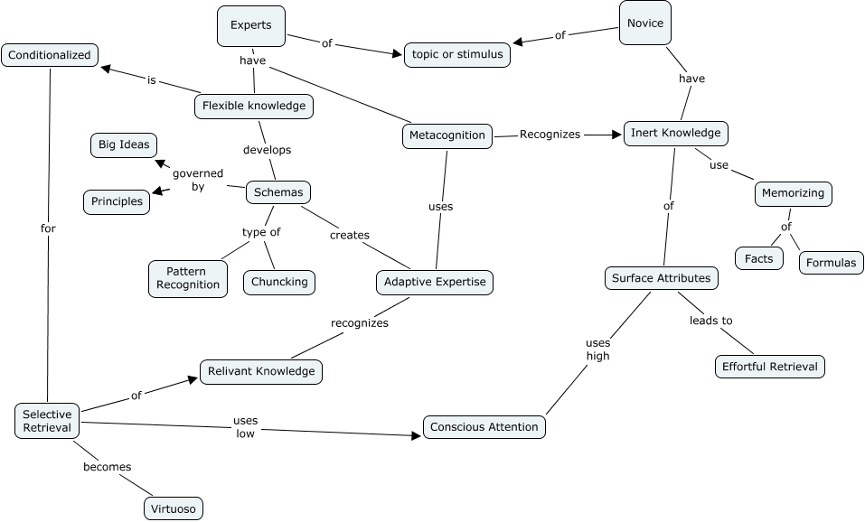 This Concept Map, created with IHMC CmapTools, has information related to: Ch.2 Experts vs Novices, Schemas governed by Big Ideas, Memorizing of Formulas, Novice of topic or stimulus, Schemas type of Chuncking, Memorizing of Facts, Experts have Flexible knowledge, Selective Retrieval becomes Virtuoso, Inert Knowledge use Memorizing, Selective Retrieval uses low Conscious Attention, Experts have Metacognition, Novice have Inert Knowledge, Flexible knowledge develops Schemas, Schemas type of Pattern Recognition, Surface Attributes uses high Conscious Attention, Conditionalized for Selective Retrieval, Inert Knowledge of Surface Attributes, Surface Attributes leads to Effortful Retrieval, Experts of topic or stimulus, Schemas governed by Principles, Metacognition Recognizes Inert Knowledge
