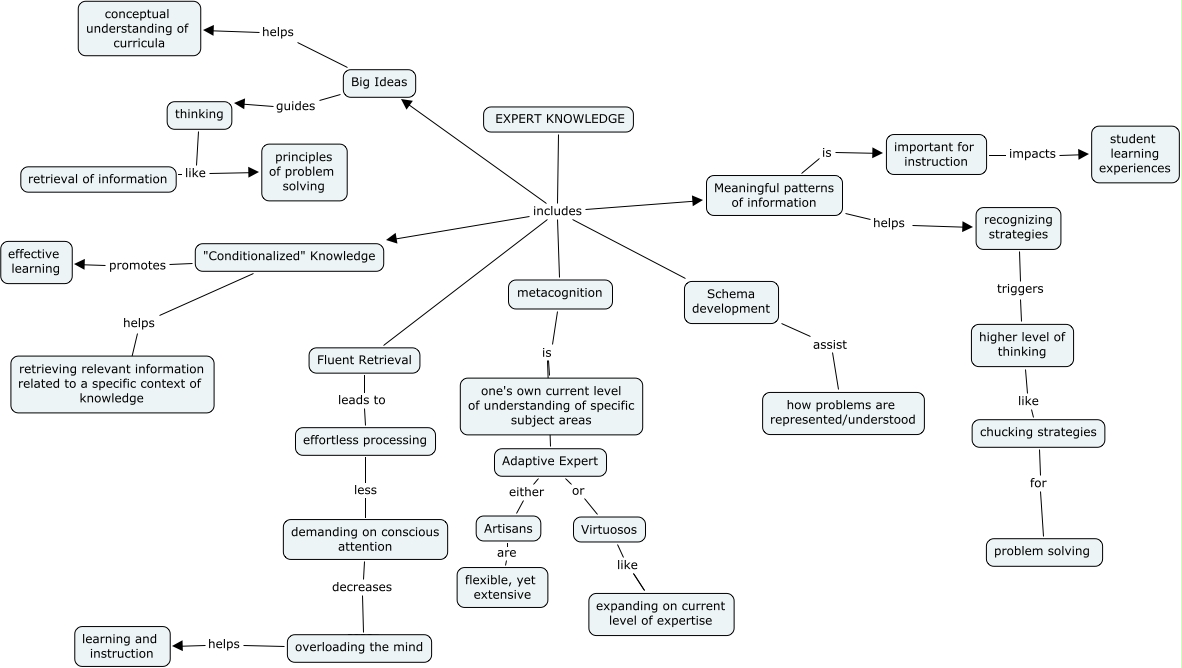 This Concept Map, created with IHMC CmapTools, has information related to: HP Chapter 2, thinking like retrieval of information, Virtuosos like expanding on current level of expertise, ???? ???? overloading the mind, "Conditionalized" Knowledge promotes effective learning, recognizing strategies triggers higher level of thinking, EXPERT KNOWLEDGE includes Meaningful patterns of information, Schema development assist how problems are represented/understood, ???? ???? overloading the mind, Fluent Retrieval leads to effortless processing, EXPERT KNOWLEDGE includes Big Ideas, EXPERT KNOWLEDGE includes Fluent Retrieval, EXPERT KNOWLEDGE includes Schema development, metacognition is Adaptive Expert, Adaptive Expert either Artisans, metacognition includes Fluent Retrieval, higher level of thinking like chucking strategies, overloading the mind helps learning and instruction, metacognition includes "Conditionalized" Knowledge, effortless processing less demanding on conscious attention, demanding on conscious attention decreases ????