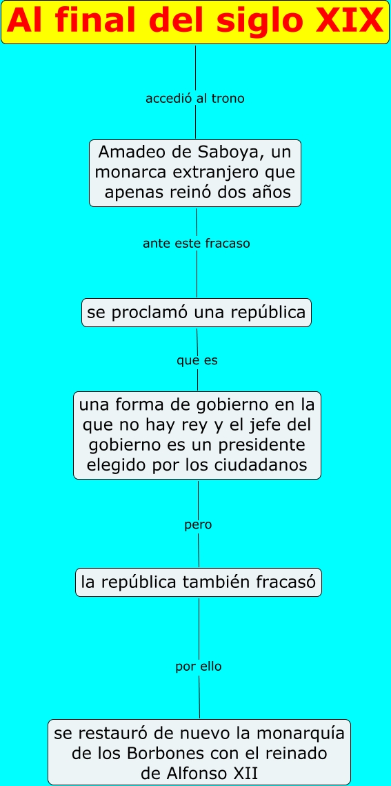 Este Cmap, tiene información relacionada con: El final del siglo XIX, la república también fracasó por ello se restauró de nuevo la monarquía de los Borbones con el reinado de Alfonso XII, Al final del siglo XIX accedió al trono Amadeo de Saboya, un monarca extranjero que apenas reinó dos años, Amadeo de Saboya, un monarca extranjero que apenas reinó dos años ante este fracaso se proclamó una república, una forma de gobierno en la que no hay rey y el jefe del gobierno es un presidente elegido por los ciudadanos pero la república también fracasó, se proclamó una república que es una forma de gobierno en la que no hay rey y el jefe del gobierno es un presidente elegido por los ciudadanos