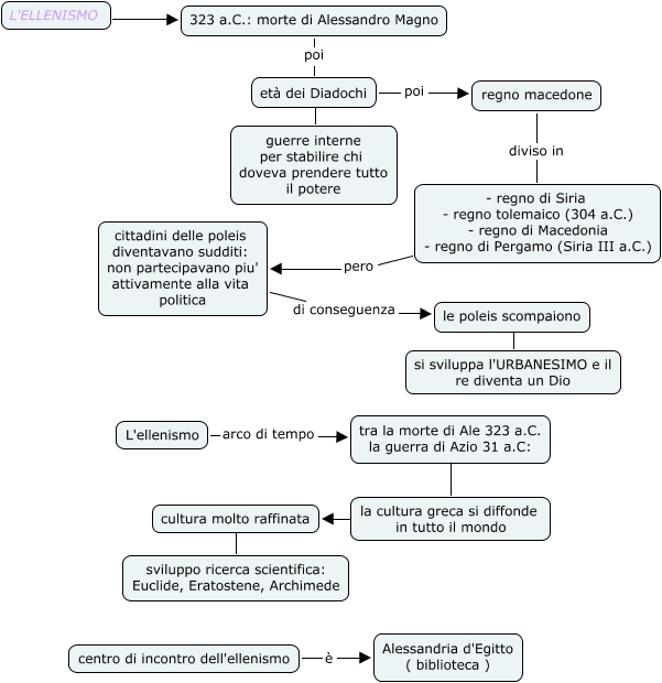 Questa Cmap, creata con IHMC CmapTools, contiene informazioni relative a: ellenismo, 323 a.C.: morte di Alessandro Magno poi età dei Diadochi, la cultura greca si diffonde in tutto il mondo ???? cultura molto raffinata, centro di incontro dell'ellenismo è Alessandria d'Egitto ( biblioteca ), cittadini delle poleis diventavano sudditi: non partecipavano piu' attivamente alla vita politica di conseguenza le poleis scompaiono, le poleis scompaiono ???? si sviluppa l'URBANESIMO e il re diventa un Dio, tra la morte di Ale 323 a.C. la guerra di Azio 31 a.C: ???? la cultura greca si diffonde in tutto il mondo, età dei Diadochi ???? guerre interne per stabilire chi doveva prendere tutto il potere, cultura molto raffinata ???? sviluppo ricerca scientifica: Euclide, Eratostene, Archimede, - regno di Siria - regno tolemaico (304 a.C.) - regno di Macedonia - regno di Pergamo (Siria III a.C.) pero cittadini delle poleis diventavano sudditi: non partecipavano piu' attivamente alla vita politica, regno macedone diviso in - regno di Siria - regno tolemaico (304 a.C.) - regno di Macedonia - regno di Pergamo (Siria III a.C.), età dei Diadochi poi regno macedone, L'ellenismo arco di tempo tra la morte di Ale 323 a.C. la guerra di Azio 31 a.C:, L'ELLENISMO ???? 323 a.C.: morte di Alessandro Magno