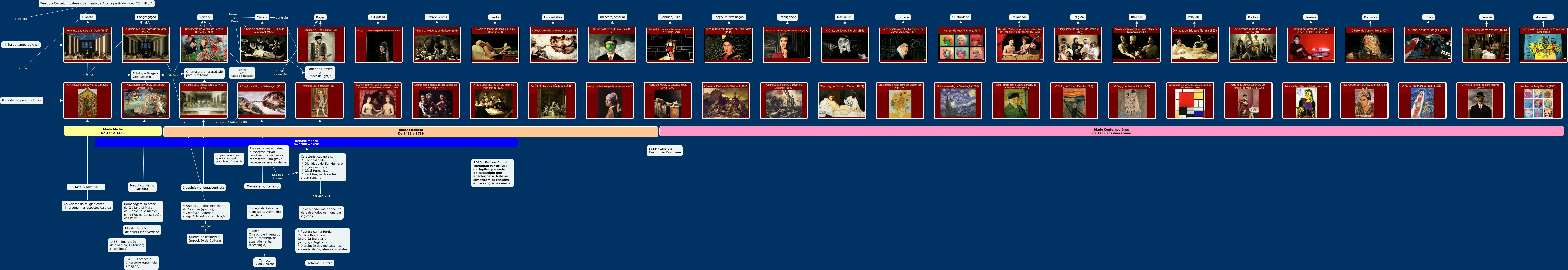 Esse mapa conceitual, produzido no IHMC CmapTools, tem a informação relacionada a: tempo e conceito - 70million, Tempo e Conceito no desenvolvimento da Arte, a partir do video "70 million" Tempo linha de tempo cronológica, linha de tempo cronológica, ~1509 O relógio é inventado em Nuremberg, na atual Alemanha (tecnologia) Tempo: Vida x Morte, Para os renascentistas, o expresso fervor religioso dos medievais representou um grave retrocesso para a ciência. Era das Trevas Características gerais: * Racionalidade * Dignidade do Ser Humano * Rigor Científico * Ideal Humanista * Reutilização das artes greco-romana, ???? União, ???? Genuíno/Puro, Celebridade Celebridade, Va Vaidade, Congregação Tradição Mitologia Grega x Cristianismo, ???? máscara/censura, ???? livre arbítrio, Ciência controle Poder do Homem x Poder da Igreja, ???? Congregação, Sobrevida Sobreviventes, Ciência Homem x Deus Poder do Homem x Poder da Igreja, Criação x Nascimento amplo conhecimento que Michelangelo possuía em Anatomia, ???? Burguesia, ???? Tensão, * Árabes e judeus expulsos da Espanha (guerra); * Cristóvão Colombo chega à América (colonização) Tradição Quebra de fronteiras; Imposição de Culturas, ???? Família