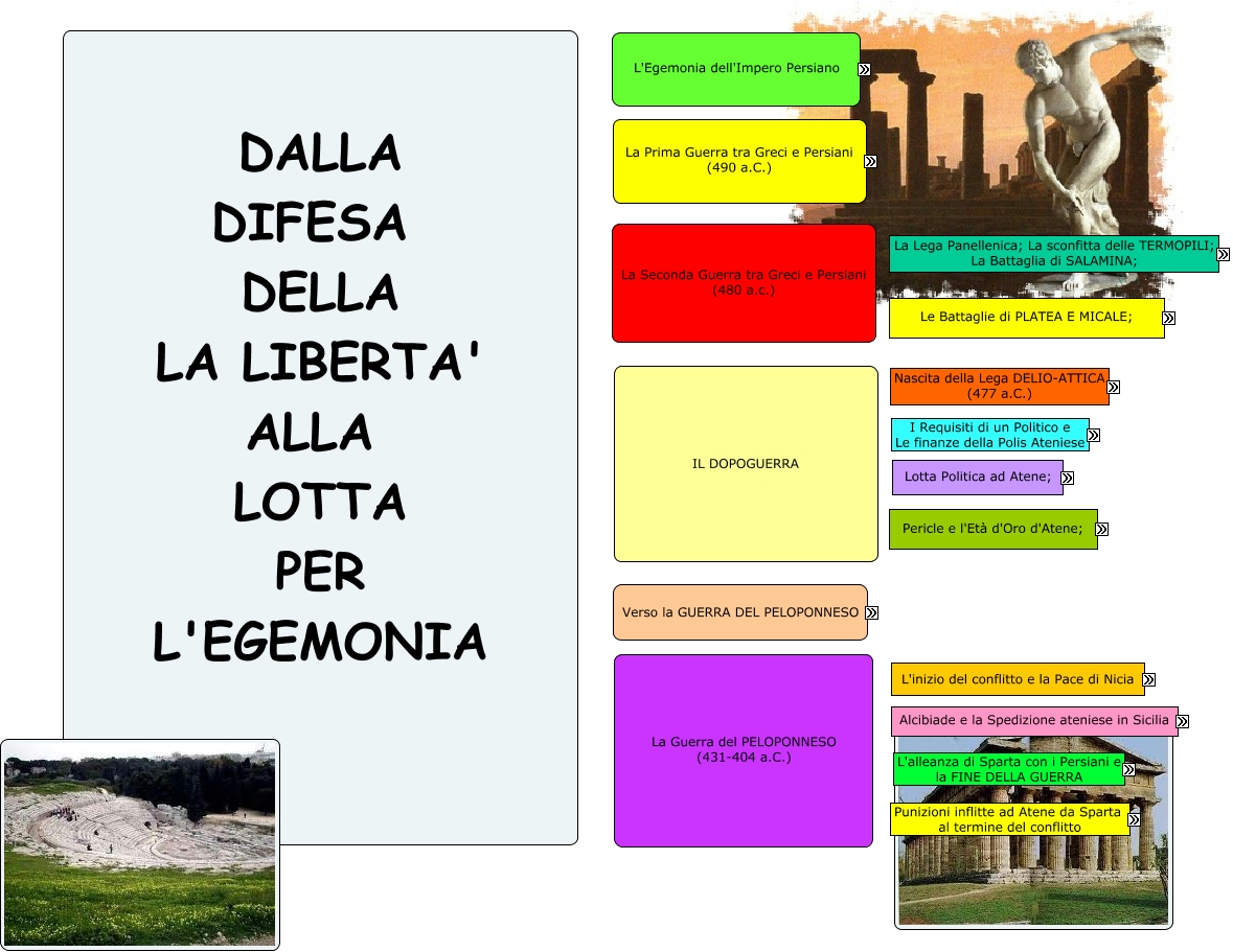 Questa Cmap, creata con IHMC CmapTools, contiene informazioni relative a: Apogeo e Declino Del Mondo Greco [Dalla difesa della libertà alla lotta per l'egemonia] Manzoni, TERMOPILI Sotto il comando del Re Spartano: LEONIDA, DISCUSSIONE fra: NICIA, UNA STREPITOSA VITTORIA nella Pianura di: MARATONA, GUERRA IDEOLOGICA tra: Oligarchia (Sparta), TRACIA dove, ad AMFIPOLI, ci fu una battaglia in cui persero la vita sia: Brasìda, STRATEGIA DI GUERRA che consisteva nel: DISTRUGGERE FLOTTA PERSIANI, di fondamentale importanza per l'Esercito, SOFISTI ovvero persone che, viaggiando per le varie POLEIS, insegnavano, soprattutto ai nobli,: L'ARTE DEL PERSUADERE ATTRAVERSO LA PAROLA, ATENE dove, nel frattempo (411 a.C), Le istituzioni Democratiche furono abbattute, LE POLEIS GRECHE obbligate a: PAGARE TRIBUTI AI SATRAPI PERSIANI, GUERRA DEL PELOPONNESO (431 a.C. - 404 a.C.) Pericle, tenendo conto della superiorità Ateniese sul mare, fece evacuare l'Attica e accolse i cittadini dentro le possenti: MURA DELLA CITTA', UNA SPEDIZIONE PUNITIVA capeggiata dal Gran Re: DARIO, LEGA DELIO-ATTICA (477-404 a.C.) che aveva come scopo: Prosecuzione Guerra contro "Barbari", CIMONE proponeva: Proseguimento Guerra contro la Persia, Tasse Indirette che, I Nobili, Per OBBLIGO MORALE, STRATEGIA che consisteva nell': Imbottigliare e distruggere le navi Ateniesi a Siracusa, Consolidamento Alleanza con Sparta Dopo l'Esilio di Temistocle (471 a.C.): Cimone sale al potere, LITURGIE Trierarchia (Provvedimento e Mantenimento di una Triremi), ATENE che dovette: Ridurre la flotta a 12 triremi, PAGARE TRIBUTI AI SATRAPI PERSIANI di conseguenza, nel 499 a.C., scoppiò: LA RIVOLTA DELLE CITTA' GRECHE, PERICLE Affiancato da: ERODOTO (Storico)