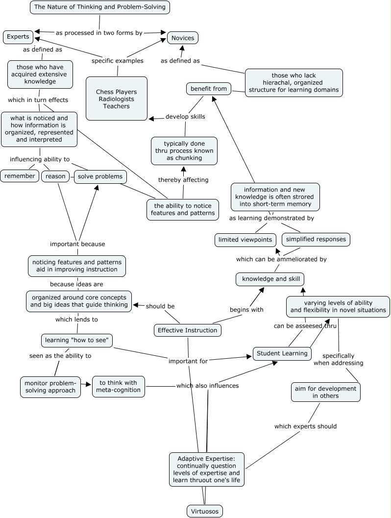 This Concept Map, created with IHMC CmapTools, has information related to: cmaponeecr, learning "how to see" important for Student Learning, Chess Players Radiologists Teachers specific examples Experts, to think with meta-cognition which also influences Adaptive Expertise: continually question levels of expertise and learn thruout one's life, limited viewpoints as learning demonstrated by information and new knowledge is often strored into short-term memory, those who lack hierachal, organized structure for learning domains as defined as Novices, noticing features and patterns aid in improving instruction because ideas are organized around core concepts and big ideas that guide thinking, learning "how to see" seen as the ability to monitor problem- solving approach, those who have acquired extensive knowledge which in turn effects the ability to notice features and patterns, typically done thru process known as chunking develop skills Chess Players Radiologists Teachers, Experts as defined as those who have acquired extensive knowledge, organized around core concepts and big ideas that guide thinking which lends to learning "how to see", limited viewpoints as learning demonstrated by simplified responses, reason important because solve problems, The Nature of Thinking and Problem-Solving as processed in two forms by Novices, The Nature of Thinking and Problem-Solving as processed in two forms by Experts, Effective Instruction begins with knowledge and skill, monitor problem- solving approach ???? to think with meta-cognition, the ability to notice features and patterns influencing ability to remember, the ability to notice features and patterns influencing ability to reason, benefit from develop skills Chess Players Radiologists Teachers