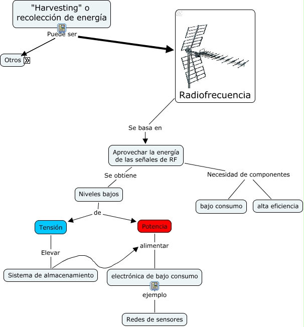 Este Cmap, tiene información relacionada con: Tarea 2, Aprovechar la energía de las señales de RF Necesidad de componentes bajo consumo, "Harvesting" o recolección de energía Puede ser Otros, Aprovechar la energía de las señales de RF Se obtiene Niveles bajos, "Harvesting" o recolección de energía Puede ser Radiofrecuencia, Niveles bajos de Tensión, Tensión Elevar Sistema de almacenamiento, Aprovechar la energía de las señales de RF Necesidad de componentes alta eficiencia, Sistema de almacenamiento alimentar electrónica de bajo consumo, Niveles bajos de Potencia, "Harvesting" o recolección de energía Puede ser Térmico, electrónica de bajo consumo ejemplo Redes de sensores, Potencia alimentar electrónica de bajo consumo, "Harvesting" o recolección de energía Puede ser Vibraciones, Radiofrecuencia Se basa en Aprovechar la energía de las señales de RF