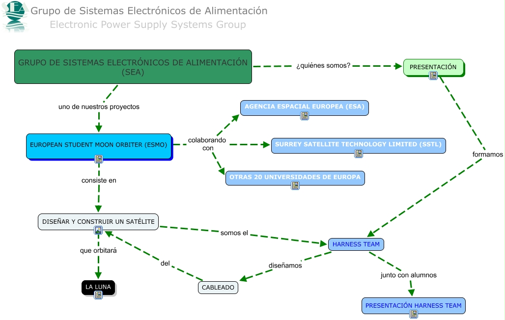 Este Cmap, tiene información relacionada con: Tarea2icetic40, PRESENTACIÓN formamos HARNESS TEAM, GRUPO DE SISTEMAS ELECTRÓNICOS DE ALIMENTACIÓN (SEA) ¿quiénes somos? PRESENTACIÓN, HARNESS TEAM diseñamos CABLEADO, EUROPEAN STUDENT MOON ORBITER (ESMO) colaborando con OTRAS 20 UNIVERSIDADES DE EUROPA, GRUPO DE SISTEMAS ELECTRÓNICOS DE ALIMENTACIÓN (SEA) uno de nuestros proyectos EUROPEAN STUDENT MOON ORBITER (ESMO), EUROPEAN STUDENT MOON ORBITER (ESMO) consiste en DISEÑAR Y CONSTRUIR UN SATÉLITE, EUROPEAN STUDENT MOON ORBITER (ESMO) colaborando con SURREY SATELLITE TECHNOLOGY LIMITED (SSTL), DISEÑAR Y CONSTRUIR UN SATÉLITE somos el HARNESS TEAM, EUROPEAN STUDENT MOON ORBITER (ESMO) colaborando con AGENCIA ESPACIAL EUROPEA (ESA), CABLEADO del DISEÑAR Y CONSTRUIR UN SATÉLITE, DISEÑAR Y CONSTRUIR UN SATÉLITE que orbitará LA LUNA, HARNESS TEAM junto con alumnos PRESENTACIÓN HARNESS TEAM