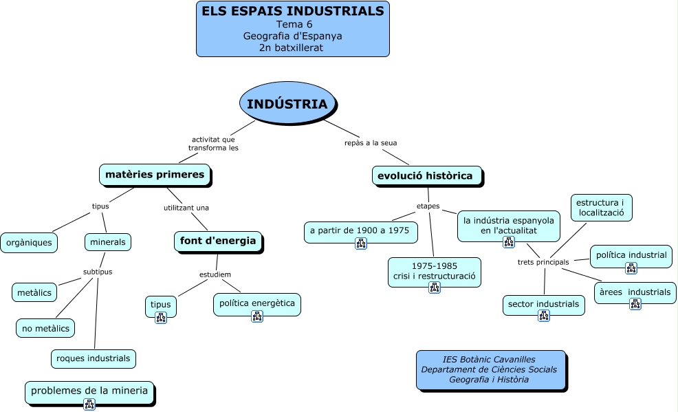Aquest mapa conceptual conté informació relacionada amb: tema6geogr1, la indústria espanyola en l'actualitat trets principals estructura i localització, font d'energia estudiem tipus, evolució històrica etapes 1975-1985 crisi i restructuració, minerals subtipus no metàlics, la indústria espanyola en l'actualitat trets principals sector industrials, evolució històrica etapes a partir de 1900 a 1975, matèries primeres tipus orgàniques, INDÚSTRIA repàs a la seua evolució històrica, font d'energia estudiem política energètica, matèries primeres utilitzant una font d'energia, minerals subtipus roques industrials, matèries primeres tipus minerals, minerals subtipus metàlics, la indústria espanyola en l'actualitat trets principals àrees industrials, INDÚSTRIA activitat que transforma les matèries primeres, la indústria espanyola en l'actualitat trets principals política industrial, evolució històrica etapes la indústria espanyola en l'actualitat