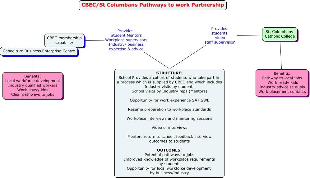 This Concept Map, created with IHMC CmapTools, has information related to: Untitled 1, St. Columbans Catholic College ???? Benefits: Pathway to local jobs Work ready kids Industry advice re quals Work placement contacts, Caboolture Business Enterprise Centre ???? Benefits: Local workforce development Industry qualified workers Work-savvy kids Clear pathways to jobs, CBEC membership capability Provides: Student Mentors Workplace supervisors Industry/ business expertise & advice STRUCTURE: School Provides a cohort of students who take part in a process which is supplied by CBEC and which includes Industry visits by students School visits by Industry reps (Mentors) Opportunity for work experience SAT,SWL Resume preparation to workplace standards Workplace interviews and mentoring sessions Video of interviews Mentors return to school, feedback interview outcomes to students OUTCOMES: Potential pathways to jobs Improved knowledge of workplace requirements by students Opportunity for local workforce development by business/industry, St. Columbans Catholic College Provides: students video staff supervision STRUCTURE: School Provides a cohort of students who take part in a process which is supplied by CBEC and which includes Industry visits by students School visits by Industry reps (Mentors) Opportunity for work experience SAT,SWL Resume preparation to workplace standards Workplace interviews and mentoring sessions Video of interviews Mentors return to school, feedback interview outcomes to students OUTCOMES: Potential pathways to jobs Improved knowledge of workplace requirements by students Opportunity for local workforce development by business/industry