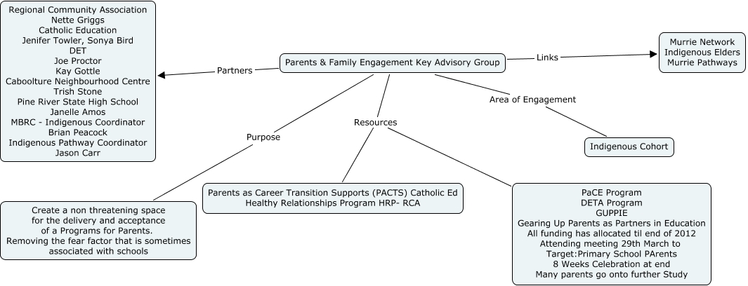 This Concept Map, created with IHMC CmapTools, has information related to: Parents & Family Engagement Key Advisory Group, Parents & Family Engagement Key Advisory Group Area of Engagement Indigenous Cohort, Parents & Family Engagement Key Advisory Group Links Murrie Network Indigenous Elders Murrie Pathways, Parents & Family Engagement Key Advisory Group Resources Parents as Career Transition Supports (PACTS) Catholic Ed Healthy Relationships Program HRP- RCA, Parents & Family Engagement Key Advisory Group Resources PaCE Program DETA Program GUPPIE Gearing Up Parents as Partners in Education All funding has allocated til end of 2012 Attending meeting 29th March to Target:Primary School PArents 8 Weeks Celebration at end Many parents go onto further Study, Parents & Family Engagement Key Advisory Group Purpose Create a non threatening space for the delivery and acceptance of a Programs for Parents. Removing the fear factor that is sometimes associated with schools, Parents & Family Engagement Key Advisory Group Partners Regional Community Association Nette Griggs Catholic Education Jenifer Towler, Sonya Bird DET Joe Proctor Kay Gottle Caboolture Neighbourhood Centre Trish Stone Pine River State High School Janelle Amos MBRC - Indigenous Coordinator Brian Peacock Indigenous Pathway Coordinator Jason Carr