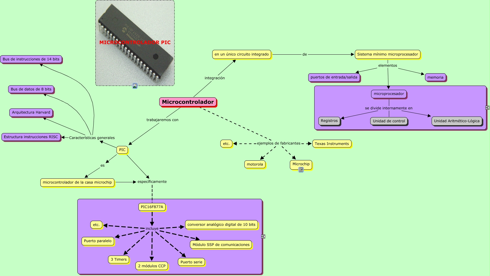 Este Cmap, tiene información relacionada con: Tarea 2, PIC Características generales Estructura instrucciones RISC, Sistema mínimo microprocesador elementos puertos de entrada/salida, PIC16F877A incluye 3 Timers, PIC16F877A incluye etc., Microcontrolador ejemplos de fabricantes etc., Microcontrolador integración en un único circuito integrado, PIC específicamente PIC16F877A, en un único circuito integrado de Sistema mínimo microprocesador, Microcontrolador trabajaremos con PIC, PIC Características generales Arquitectura Harvard, PIC16F877A incluye 2 módulos CCP, Microcontrolador ejemplos de fabricantes Microchip, Microcontrolador ejemplos de fabricantes Texas Instruments, microprocesador se divide internamente en Unidad de control, PIC Características generales Bus de instrucciones de 14 bits, PIC16F877A incluye conversor analógico digital de 10 bits, microprocesador se divide internamente en Unidad Aritmético-Lógica, PIC es microcontrolador de la casa microchip, PIC16F877A incluye Puerto paralelo, Sistema mínimo microprocesador elementos memoria