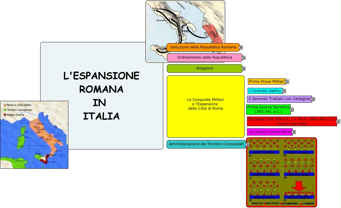 Questa Cmap, creata con IHMC CmapTools, contiene informazioni relative a: L'Italia e Roma [L'Espansione Romana in Italia] Manzoni, PIRRO, Re d'Epiro che voleva emulare: Il Progetto di Alessandro Magno in Occidente, Roma dopo l'istituzione della repubblica, fu protagonista di: Alcuni CONFLITTI, Consenso fondamentale per l'istituzione di un: Grande Impero, Colonie Romane che svolgevano una funzione di: Presidio Militare, I Territori Conquistati facendo una suddivisione in: Alleati Italici (Socii italici), Municipi che raggruppavano: Citadini Privi di Diritto di Voto, Istituzione di una REPUBBLICA nella quale, dopo un primo controllo assunto dal magister populi e dal magister equitum, il controllo fu assunto da: DUE CONSOLI, Alcuni CONFLITTI con: LATINI, SENATO (300 ex magistrati, eletti a vita) :poteri, a livello politico, illimitati: nomina, in caso di grave crisi, un: DITTATORE (in carica 6 mesi) :poteri illimitati:, CONCILI DELLA PLEBE [ammessi nel 494 a.C.] (35 tribù) :poteri legislativi e giudiziari: eleggono TRIBUNI DELLA PLEBE (in carica 1 anno) :diritto di proporre plebisciti: :diritto di veto:, La Religione Romana fu profondamente influenzata dalla: Religione GRECA, ALLIA (390 a.C.) piombò su Roma e: Saccheggiò, Incendiandola, la città, LATINI che portò, in seguito alla: Battaglia sul Lago Regillo (496 a.C.), I Territori Conquistati facendo una suddivisione in: Territorio Romano (Terre annesse all'Agro Romano), Gli Interessi di Roma e, tra i due schieramenti, scoppiò un conflitto che prese il nome di: PRIMA GUERRA SANNITICA (343 - 341 a.C.), MALEVENTUM sul cui esito ci furono: Versioni Contrastanti, DUE CONSOLI che, in caso di situazioni piuttosto gravi, potevao nominare un: DITTATORE (In carica 6 mesi), Roma nel 508 a.C. stipulò: Un trattato con CARTAGINE, I Territori Conquistati facendo una suddivisione in: Colonie Romane, Saccheggiò, Incendiandola, la città e se ne andò solo: Dopo aver ricevuto un Ricco RISCATTO