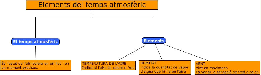 Este Cmap, tiene información relacionada con: esquema 1 tema 3, Elements del temps atmosfèric El temps atmosfèric És l'estat de l'atmosfera en un lloc i en un moment precisos., Elements del temps atmosfèric Elements VENT Aire en moviment. Fa variar la sensació de fred o calor., Elements del temps atmosfèric Elements HUMITAT indica la quantitat de vapor d'aigua que hi ha en l'aire, Elements del temps atmosfèric Elements TEMPERATURA DE L'AIRE Indica si l'aire és calent o fred