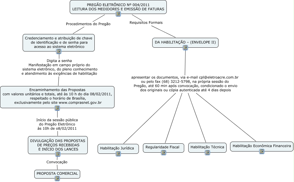 Esse mapa conceitual, produzido no IHMC CmapTools, tem a informação relacionada a: Pregão 004 2011, DA HABILITAÇÃO – (ENVELOPE II) apresentar os documentos, via e-mail cpl@eletroacre.com.br ou pelo fax (68) 3212-5798, na própria sessão do Pregão, até 60 min após convocação, condicionado o envio dos originais ou cópia autenticada até 4 dias depois Regularidade Fiscal, Encaminhamento das Propostas com valores unitários e totais, até às 10 h do dia 08/02/2011, respeitado o horário de Brasília, exclusivamente pelo site www.comprasnet.gov.br Início da sessão pública do Pregão Eletrônico às 10h de o8/02/2011 DIVULGAÇÃO DAS PROPOSTAS DE PREÇOS RECEBIDAS E INÍCIO DOS LANCES, DA HABILITAÇÃO – (ENVELOPE II) apresentar os documentos, via e-mail cpl@eletroacre.com.br ou pelo fax (68) 3212-5798, na própria sessão do Pregão, até 60 min após convocação, condicionado o envio dos originais ou cópia autenticada até 4 dias depois Habilitação Econômica Financeira, DIVULGAÇÃO DAS PROPOSTAS DE PREÇOS RECEBIDAS E INÍCIO DOS LANCES Convocação PROPOSTA COMERCIAL, Credenciamento e atribuição de chave de identificação e de senha para acesso ao sistema eletrônico Digita a senha Manifestação em campo próprio do sistema eletrônico, do pleno conhecimento e atendimento às exigências de habilitação Encaminhamento das Propostas com valores unitários e totais, até às 10 h do dia 08/02/2011, respeitado o horário de Brasília, exclusivamente pelo site www.comprasnet.gov.br, PREGÃO ELETRÔNICO Nº 004/2011 LEITURA DOS MEDIDORES E EMISSÃO DE FATURAS Requisitos Formais DA HABILITAÇÃO – (ENVELOPE II), PREGÃO ELETRÔNICO Nº 004/2011 LEITURA DOS MEDIDORES E EMISSÃO DE FATURAS Procedimentos do Pregão Credenciamento e atribuição de chave de identificação e de senha para acesso ao sistema eletrônico, DA HABILITAÇÃO – (ENVELOPE II) apresentar os documentos, via e-mail cpl@eletroacre.com.br ou pelo fax (68) 3212-5798, na própria sessão do Pregão, até 60 min após convocação, condicionado o envio dos originais ou cópia autenticada até 4 dias depois Habilitação Jurídica, DA HABILITAÇÃO – (ENVELOPE II) apresentar os documentos, via e-mail cpl@eletroacre.com.br ou pelo fax (68) 3212-5798, na própria sessão do Pregão, até 60 min após convocação, condicionado o envio dos originais ou cópia autenticada até 4 dias depois Habilitação Técnica