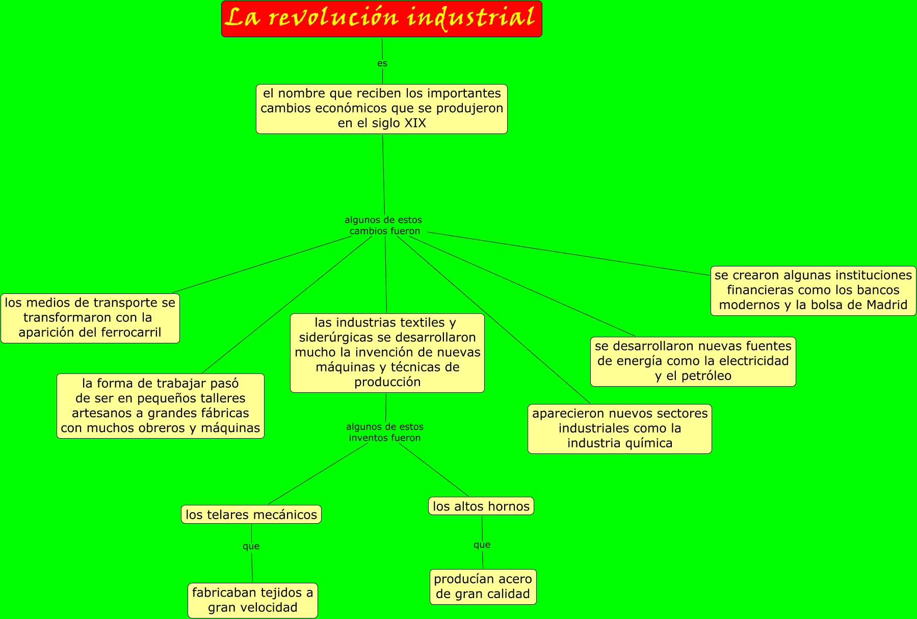Este Cmap, tiene información relacionada con: La revolución industrial, las industrias textiles y siderúrgicas se desarrollaron mucho la invención de nuevas máquinas y técnicas de producción algunos de estos inventos fueron los altos hornos, los telares mecánicos que fabricaban tejidos a gran velocidad, el nombre que reciben los importantes cambios económicos que se produjeron en el siglo XIX algunos de estos cambios fueron se crearon algunas instituciones financieras como los bancos modernos y la bolsa de Madrid, los altos hornos que producían acero de gran calidad, el nombre que reciben los importantes cambios económicos que se produjeron en el siglo XIX algunos de estos cambios fueron aparecieron nuevos sectores industriales como la industria química, el nombre que reciben los importantes cambios económicos que se produjeron en el siglo XIX algunos de estos cambios fueron se desarrollaron nuevas fuentes de energía como la electricidad y el petróleo, el nombre que reciben los importantes cambios económicos que se produjeron en el siglo XIX algunos de estos cambios fueron la forma de trabajar pasó de ser en pequeños talleres artesanos a grandes fábricas con muchos obreros y máquinas, el nombre que reciben los importantes cambios económicos que se produjeron en el siglo XIX algunos de estos cambios fueron las industrias textiles y siderúrgicas se desarrollaron mucho la invención de nuevas máquinas y técnicas de producción, las industrias textiles y siderúrgicas se desarrollaron mucho la invención de nuevas máquinas y técnicas de producción algunos de estos inventos fueron los telares mecánicos, el nombre que reciben los importantes cambios económicos que se produjeron en el siglo XIX algunos de estos cambios fueron los medios de transporte se transformaron con la aparición del ferrocarril, La revolución industrial es el nombre que reciben los importantes cambios económicos que se produjeron en el siglo XIX