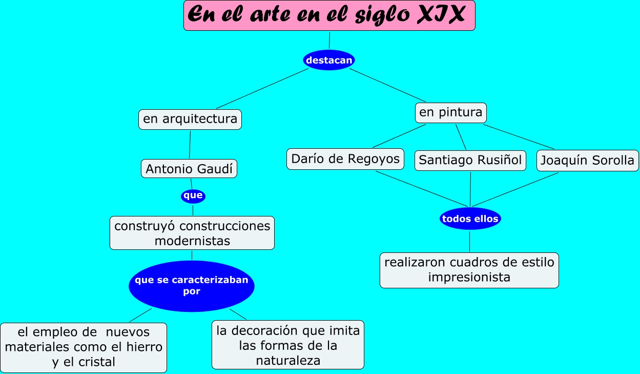 Este Cmap, tiene información relacionada con: El arte en el siglo XIX, En el arte en el siglo XIX destacan en pintura, construyó construcciones modernistas que se caracterizaban por la decoración que imita las formas de la naturaleza, Antonio Gaudí que construyó construcciones modernistas, construyó construcciones modernistas que se caracterizaban por el empleo de nuevos materiales como el hierro y el cristal, Joaquín Sorolla todos ellos realizaron cuadros de estilo impresionista, en pintura Darío de Regoyos, en pintura Joaquín Sorolla, Darío de Regoyos todos ellos realizaron cuadros de estilo impresionista, en pintura Santiago Rusiñol, Santiago Rusiñol todos ellos realizaron cuadros de estilo impresionista, en arquitectura Antonio Gaudí, En el arte en el siglo XIX destacan en arquitectura