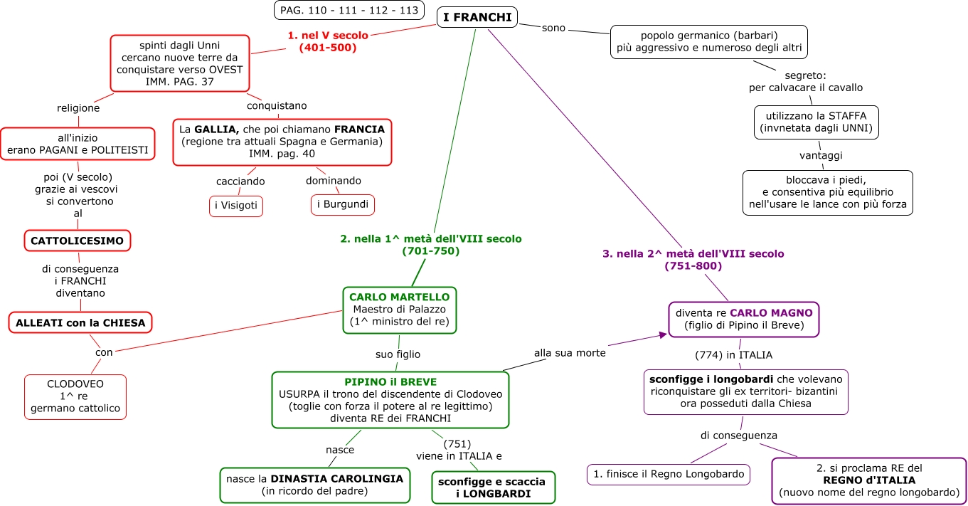 Questa Cmap, creata con IHMC CmapTools, contiene informazioni relative a: 18_franchi_sintesi, sconfigge i longobardi che volevano riconquistare gli ex territori- bizantini ora posseduti dalla Chiesa di conseguenza 2. si proclama RE del REGNO d'ITALIA (nuovo nome del regno longobardo), popolo germanico (barbari) più aggressivo e numeroso degli altri segreto: per calvacare il cavallo utilizzano la STAFFA (invnetata dagli UNNI), PIPINO il BREVE USURPA il trono del discendente di Clodoveo (toglie con forza il potere al re legittimo) diventa RE dei FRANCHI alla sua morte diventa re CARLO MAGNO (figlio di Pipino il Breve), I FRANCHI sono popolo germanico (barbari) più aggressivo e numeroso degli altri, sconfigge i longobardi che volevano riconquistare gli ex territori- bizantini ora posseduti dalla Chiesa di conseguenza 1. finisce il Regno Longobardo, spinti dagli Unni cercano nuove terre da conquistare verso OVEST IMM. PAG. 37 religione all'inizio erano PAGANI e POLITEISTI, PIPINO il BREVE USURPA il trono del discendente di Clodoveo (toglie con forza il potere al re legittimo) diventa RE dei FRANCHI nasce nasce la DINASTIA CAROLINGIA (in ricordo del padre), PIPINO il BREVE USURPA il trono del discendente di Clodoveo (toglie con forza il potere al re legittimo) diventa RE dei FRANCHI (751) viene in ITALIA e sconfigge e scaccia i LONGBARDI, all'inizio erano PAGANI e POLITEISTI poi (V secolo) grazie ai vescovi si convertono al CATTOLICESIMO, ALLEATI con la CHIESA con CARLO MARTELLO Maestro di Palazzo (1^ ministro del re), La GALLIA, che poi chiamano FRANCIA (regione tra attuali Spagna e Germania) IMM. pag. 40 cacciando i Visigoti, utilizzano la STAFFA (invnetata dagli UNNI) vantaggi bloccava i piedi, e consentiva più equilibrio nell'usare le lance con più forza, spinti dagli Unni cercano nuove terre da conquistare verso OVEST IMM. PAG. 37 conquistano La GALLIA, che poi chiamano FRANCIA (regione tra attuali Spagna e Germania) IMM. pag. 40, La GALLIA, che poi chiamano FRANCIA (regione tra attuali Spagna e Germania) IMM. pag. 40 dominando i Burgundi, CATTOLICESIMO di conseguenza i FRANCHI diventano ALLEATI con la CHIESA, diventa re CARLO MAGNO (figlio di Pipino il Breve) (774) in ITALIA sconfigge i longobardi che volevano riconquistare gli ex territori- bizantini ora posseduti dalla Chiesa, I FRANCHI 1. nel V secolo (401-500) spinti dagli Unni cercano nuove terre da conquistare verso OVEST IMM. PAG. 37, PIPINO il BREVE USURPA il trono del discendente di Clodoveo (toglie con forza il potere al re legittimo) diventa RE dei FRANCHI suo figlio CARLO MARTELLO Maestro di Palazzo (1^ ministro del re), I FRANCHI 3. nella 2^ metà dell'VIII secolo (751-800) diventa re CARLO MAGNO (figlio di Pipino il Breve), ALLEATI con la CHIESA con CLODOVEO 1^ re germano cattolico