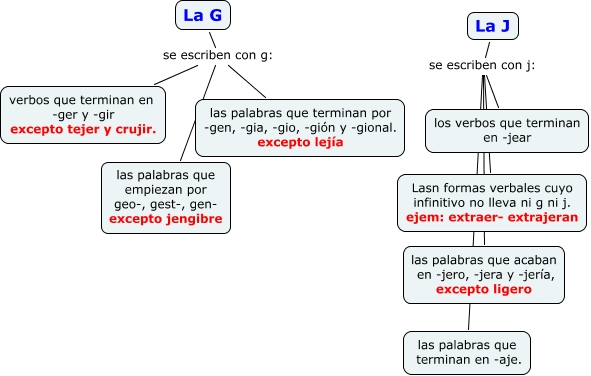 Este Cmap, tiene información relacionada con: La g y la j, La G se escriben con g: las palabras que empiezan por geo-, gest-, gen- excepto jengibre, La J se escriben con j: Lasn formas verbales cuyo infinitivo no lleva ni g ni j. ejem: extraer- extrajeran, La J se escriben con j: las palabras que acaban en -jero, -jera y -jería, excepto ligero, La G se escriben con g: las palabras que terminan por -gen, -gia, -gio, -gión y -gional. excepto lejía, La J se escriben con j: las palabras que terminan en -aje., La J se escriben con j: los verbos que terminan en -jear, La G se escriben con g: verbos que terminan en -ger y -gir excepto tejer y crujir.