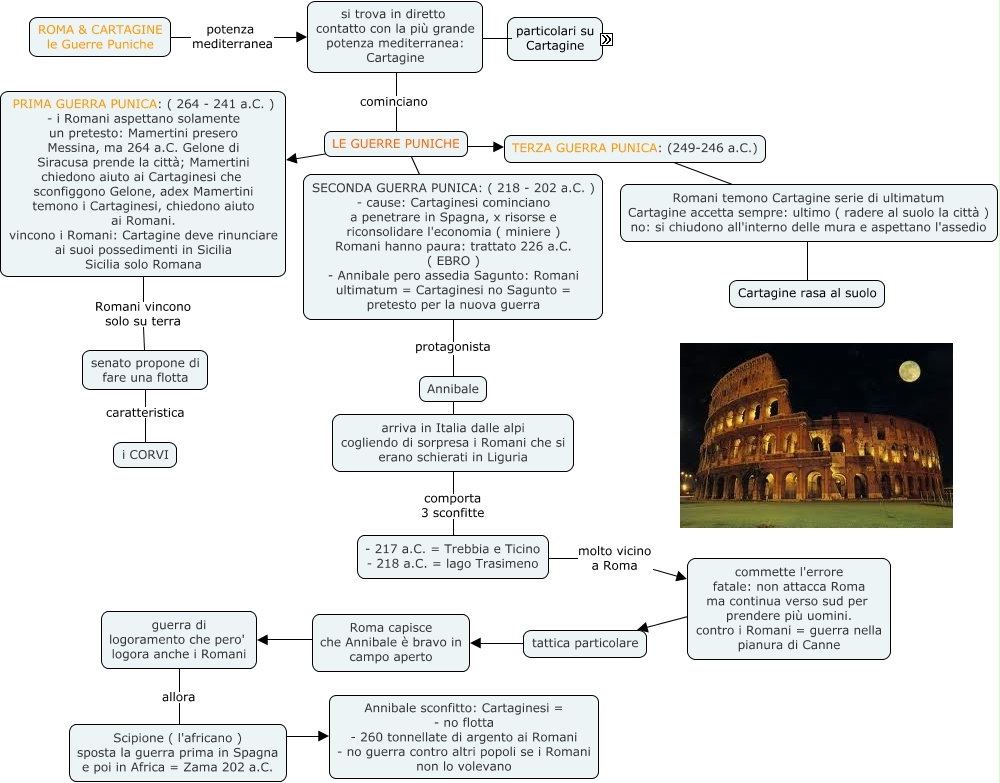 Questa Cmap, creata con IHMC CmapTools, contiene informazioni relative a: roma e cartagine guerre punche ( sofia bettoni ), commette l'errore fatale: non attacca Roma ma continua verso sud per prendere più uomini. contro i Romani = guerra nella pianura di Canne ???? tattica particolare, PRIMA GUERRA PUNICA: ( 264 - 241 a.C. ) - i Romani aspettano solamente un pretesto: Mamertini presero Messina, ma 264 a.C. Gelone di Siracusa prende la città; Mamertini chiedono aiuto ai Cartaginesi che sconfiggono Gelone, adex Mamertini temono i Cartaginesi, chiedono aiuto ai Romani. vincono i Romani: Cartagine deve rinunciare ai suoi possedimenti in Sicilia Sicilia solo Romana Romani vincono solo su terra senato propone di fare una flotta, si trova in diretto contatto con la più grande potenza mediterranea: Cartagine cominciano LE GUERRE PUNICHE, tattica particolare ???? Roma capisce che Annibale è bravo in campo aperto, Scipione ( l'africano ) sposta la guerra prima in Spagna e poi in Africa = Zama 202 a.C. ???? Annibale sconfitto: Cartaginesi = - no flotta - 260 tonnellate di argento ai Romani - no guerra contro altri popoli se i Romani non lo volevano, ROMA & CARTAGINE le Guerre Puniche potenza mediterranea si trova in diretto contatto con la più grande potenza mediterranea: Cartagine, - 217 a.C. = Trebbia e Ticino - 218 a.C. = lago Trasimeno molto vicino a Roma commette l'errore fatale: non attacca Roma ma continua verso sud per prendere più uomini. contro i Romani = guerra nella pianura di Canne, SECONDA GUERRA PUNICA: ( 218 - 202 a.C. ) - cause: Cartaginesi cominciano a penetrare in Spagna, x risorse e riconsolidare l'economia ( miniere ) Romani hanno paura: trattato 226 a.C. ( EBRO ) - Annibale pero assedia Sagunto: Romani ultimatum = Cartaginesi no Sagunto = pretesto per la nuova guerra protagonista Annibale, si trova in diretto contatto con la più grande potenza mediterranea: Cartagine era una potenza che si basava su una politica oligarchica, sull'agricoltura e sulle rotte commerciali dell'occidente, esercito solo poche xsn, guerra di logoramento che pero' logora anche i Romani allora Scipione ( l'africano ) sposta la guerra prima in Spagna e poi in Africa = Zama 202 a.C., Roma capisce che Annibale è bravo in campo aperto ???? guerra di logoramento che pero' logora anche i Romani, Romani temono Cartagine serie di ultimatum Cartagine accetta sempre: ultimo ( radere al suolo la città ) no: si chiudono all'interno delle mura e aspettano l'assedio ???? Cartagine rasa al suolo, si trova in diretto contatto con la più grande potenza mediterranea: Cartagine era occupava il territorio dell'attuale Tunisia, parte della Libia, la Sicilia centrale e occident., la Sardegna e la Corsica, LE GUERRE PUNICHE ???? SECONDA GUERRA PUNICA: ( 218 - 202 a.C. ) - cause: Cartaginesi cominciano a penetrare in Spagna, x risorse e riconsolidare l'economia ( miniere ) Romani hanno paura: trattato 226 a.C. ( EBRO ) - Annibale pero assedia Sagunto: Romani ultimatum = Cartaginesi no Sagunto = pretesto per la nuova guerra, TERZA GUERRA PUNICA: (249-246 a.C.) ???? Romani temono Cartagine serie di ultimatum Cartagine accetta sempre: ultimo ( radere al suolo la città ) no: si chiudono all'interno delle mura e aspettano l'assedio, Annibale ???? arriva in Italia dalle alpi cogliendo di sorpresa i Romani che si erano schierati in Liguria, LE GUERRE PUNICHE ???? PRIMA GUERRA PUNICA: ( 264 - 241 a.C. ) - i Romani aspettano solamente un pretesto: Mamertini presero Messina, ma 264 a.C. Gelone di Siracusa prende la città; Mamertini chiedono aiuto ai Cartaginesi che sconfiggono Gelone, adex Mamertini temono i Cartaginesi, chiedono aiuto ai Romani. vincono i Romani: Cartagine deve rinunciare ai suoi possedimenti in Sicilia Sicilia solo Romana, senato propone di fare una flotta caratteristica i CORVI, arriva in Italia dalle alpi cogliendo di sorpresa i Romani che si erano schierati in Liguria comporta 3 sconfitte - 217 a.C. = Trebbia e Ticino - 218 a.C. = lago Trasimeno, LE GUERRE PUNICHE ???? TERZA GUERRA PUNICA: (249-246 a.C.)