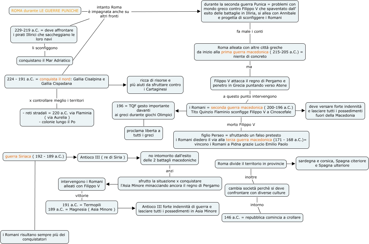 Questa Cmap, creata con IHMC CmapTools, contiene informazioni relative a: roma durante le guerre puniche, Roma divide il territorio in provincie ???? sardegna e corsica, Spagna citeriore e Spagna ulteriore, 196 = TQF gesto importante davanti ai greci durante giochi Olimpici ???? proclama liberta a tutti i greci, ROMA durante LE GUERRE PUNICHE intanto Roma è impagnata anche su altri fronti 229-219 a.C. = deve affrontare i pirati Illirici che saccheggiano le loro navi, 191 a.C. = Termopili 189 a.C. = Magnesia ( Asia Minore ) ???? Antioco III forte indennità di guerra e lasciare tutti i possedimenti in Asia Minore, 224 - 191 a.C. = conquista il nord: Gallia Cisalpina e Gallia Cispadana x controllare meglio i territori - reti stradali = 220 a.C. via Flaminia ( via Aurelia ) - colonie lungo il Po, sfrutto la situazione x conquistare l'Asia Minore minacciando ancora il regno di Pergamo ???? intervengono i Romani alleati con Filippo V, durante la seconda guerra Punica = problemi con mondo greco contro Filippo V che spaventato dall' esito delle battaglie in Illiria, si allea con Annibale e progetta di sconfiggere i Romani fa male i conti Roma alleata con altre città greche da inizio alla prima guerra macedonica ( 215-205 a.C.) = niente di concreto, cambia società perchè si deve confrontare con diverse culture intorno 146 a.C. = repubblica comincia a crollare, Antioco III ( re di Siria ) ???? no intomorito dall'esito delle 2 battagli macedoniche, i Romani = seconda guerra macedonica ( 200-196 a.C.) Tito Quinzio Flaminio sconfigge Filippo V a Cinoscefale ???? deve versare forte indennità e lasciare tutti i possedimenti fuori della Macedonia, ROMA durante LE GUERRE PUNICHE intanto Roma è impagnata anche su altri fronti 224 - 191 a.C. = conquista il nord: Gallia Cisalpina e Gallia Cispadana, Filippo V attacca il regno di Pergamo e penetro in Grecia puntando verso Atene a questo punto intervengono i Romani = seconda guerra macedonica ( 200-196 a.C.) Tito Quinzio Flaminio sconfigge Filippo V a Cinoscefale, i Romani = seconda guerra macedonica ( 200-196 a.C.) Tito Quinzio Flaminio sconfigge Filippo V a Cinoscefale ???? 196 = TQF gesto importante davanti ai greci durante giochi Olimpici, ROMA durante LE GUERRE PUNICHE intanto Roma è impagnata anche su altri fronti durante la seconda guerra Punica = problemi con mondo greco contro Filippo V che spaventato dall' esito delle battaglie in Illiria, si allea con Annibale e progetta di sconfiggere i Romani, no intomorito dall'esito delle 2 battagli macedoniche anzi sfrutto la situazione x conquistare l'Asia Minore minacciando ancora il regno di Pergamo, 224 - 191 a.C. = conquista il nord: Gallia Cisalpina e Gallia Cispadana ???? ricca di risorse e più aiuti da sfruttare contro i Cartaginesi, 229-219 a.C. = deve affrontare i pirati Illirici che saccheggiano le loro navi li sconfiggono conquistano il Mar Adriatico, i Romani = seconda guerra macedonica ( 200-196 a.C.) Tito Quinzio Flaminio sconfigge Filippo V a Cinoscefale morto Filippo V figlio Perseo = sfruttando un falso pretesto i Romani diedero il via alla terza guerra macedonica (171 - 168 a.C.)= vincono i Romani a Pidna grazie Lucio Emilio Paolo, Roma divide il territorio in provincie inoltre cambia società perchè si deve confrontare con diverse culture, guerra Siriaca ( 192 - 189 a.C.) ???? Antioco III ( re di Siria )