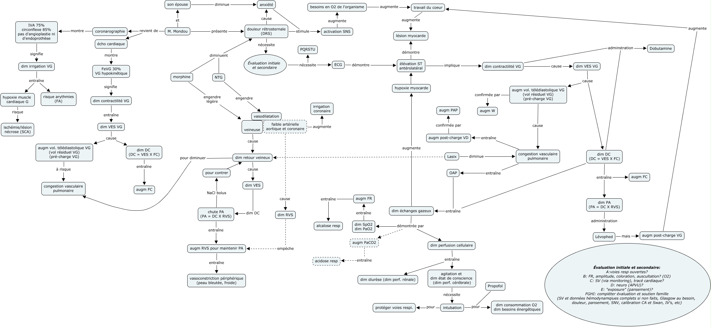 Cette carte de concepts créée avec IHMC CmapTools traite de: SIC M. Mondou 2 H11, NTG diminuent douleur rétrosternale (DRS), Évaluation initiale et secondaire nécessite PQRSTU, dim contractilité VG entraîne dim VES VG, douleur rétrosternale (DRS) stimule activation SNS, intubation pour dim consommation O2 dim besoins énergétiques, augm vol. télédiastolique VG (vol résiduel VG) (pré-charge VG) confirmée par augm W, intubation pour protéger voies respi., congestion vasculaire pulmonaire entraîne OAP, activation SNS augmente besoins en O2 de l'organisme, OAP entraîne dim échanges gazeux, Évaluation initiale et secondaire nécessite ECG, dim échanges gazeux démontrée par augm PaCO2, douleur rétrosternale (DRS) nécessite Évaluation initiale et secondaire, dim SpO2 dim PaO2 entraîne augm FR, M. Mondou et son épouse, augm RVS pour maintenir PA entraîne vasoconstriction périphérique (peau bleutée, froide), dim échanges gazeux augmente hypoxie myocarde, besoins en O2 de l'organisme augmente travail du coeur, agitation et dim état de conscience (dim perf. cérébrale) nécessite intubation, hypoxie muscle cardiaque G risque ischémie/lésion nécrose (SCA)