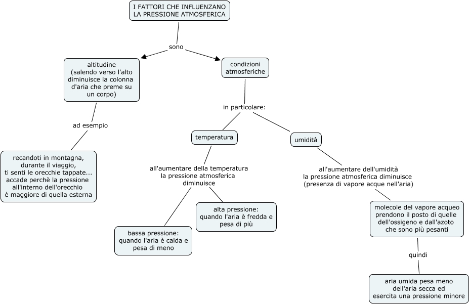Questa Cmap, creata con IHMC CmapTools, contiene informazioni relative a: I Fattori Che Influenzano L'Atmosfera- Aurora, umidità all'aumentare dell'umidità la pressione atmosferica diminuisce (presenza di vapore acque nell'aria) molecole del vapore acqueo prendono il posto di quelle dell'ossigeno e dall'azoto che sono più pesanti, altitudine (salendo verso l'alto diminuisce la colonna d'aria che preme su un corpo) ad esempio recandoti in montagna, durante il viaggio, ti senti le orecchie tappate... accade perchè la pressione all'interno dell'orecchio è maggiore di quella esterna, temperatura all'aumentare della temperatura la pressione atmosferica diminuisce alta pressione: quando l'aria è fredda e pesa di più, condizioni atmosferiche in particolare: umidità, I FATTORI CHE INFLUENZANO LA PRESSIONE ATMOSFERICA sono condizioni atmosferiche, temperatura all'aumentare della temperatura la pressione atmosferica diminuisce bassa pressione: quando l'aria è calda e pesa di meno, condizioni atmosferiche in particolare: temperatura, molecole del vapore acqueo prendono il posto di quelle dell'ossigeno e dall'azoto che sono più pesanti quindi aria umida pesa meno dell'aria secca ed esercita una pressione minore, I FATTORI CHE INFLUENZANO LA PRESSIONE ATMOSFERICA sono altitudine (salendo verso l'alto diminuisce la colonna d'aria che preme su un corpo)