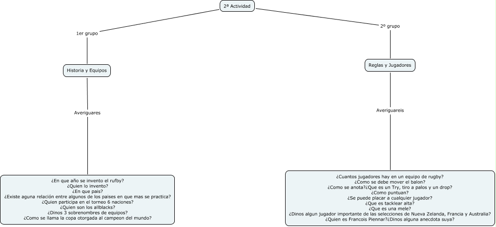 Este Cmap, tiene información relacionada con: Actividad Rugby, 2ª Actividad 2º grupo Reglas y Jugadores, Reglas y Jugadores Averiguareis ¿Cuantos jugadores hay en un equipo de rugby? ¿Como se debe mover el balon? ¿Como se anota?¿Que es un Try, tiro a palos y un drop? ¿Como puntuan? ¿Se puede placar a cualquier jugador? ¿Que es tacklear alta? ¿Que es una mele? ¿Dinos algun jugador importante de las selecciones de Nueva Zelanda, Francia y Australia? ¿Quien es Francois Piennar?¿Dinos alguna anecdota suya?, 2ª Actividad 1er grupo Historia y Equipos, Historia y Equipos Averiguares ¿En que año se invento el rufby? ¿Quien lo invento? ¿En que pais? ¿Existe aguna relación entre algunos de los paises en que mas se practica? ¿Quien participa en el torneo 6 naciones? ¿Quien son los allblacks? ¿Dinos 3 sobrenombres de equipos? ¿Como se llama la copa otorgada al campeon del mundo?