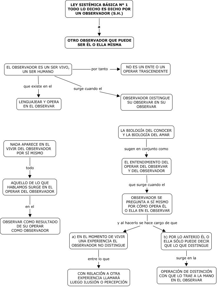 Este Cmap, tiene información relacionada con: LEY SISTÉMICA BÁSICA Nº 1; OBSERVAR, LEY SISTÉMICA BÁSICA Nº 1 TODO LO DICHO ES DICHO POR UN OBSERVADOR (S.H.) a OTRO OBSERVADOR QUE PUEDE SER ÉL O ELLA MISMA, EL OBSERVADOR ES UN SER VIVO, UN SER HUMANO por tanto NO ES UN ENTE O UN OPERAR TRASCENDENTE, EL OBSERVADOR ES UN SER VIVO, UN SER HUMANO surge cuando el OBSERVADOR DISTINGUE SU OBSERVAR EN SU OBSERVAR, NADA APARECE EN EL VIVIR DEL OBSERVADOR POR SÍ MISMO todo AQUELLO DE LO QUE HABLAMOS SURGE EN EL OPERAR DEL OBSERVADOR, AQUELLO DE LO QUE HABLAMOS SURGE EN EL OPERAR DEL OBSERVADOR en el OBSERVAR COMO RESULTADO DE SU OPERAR COMO OBSERVADOR, LA BIOLOGÍA DEL CONOCER Y LA BIOLOGÍA DEL AMAR sugen en conjunto como EL ENTENDIMIENTO DEL OPERAR DEL OBSERVAR Y DEL OBSERVADOR, EL ENTENDIMIENTO DEL OPERAR DEL OBSERVAR Y DEL OBSERVADOR que surge cuando el OBSERVADOR SE PREGUNTA A SÍ MISMO POR CÓMO OPERA ÉL O ELLA EN EL OBSERVAR, OBSERVADOR SE PREGUNTA A SÍ MISMO POR CÓMO OPERA ÉL O ELLA EN EL OBSERVAR y al hacerlo se hace cargo de que a) EN EL MOMENTO DE VIVIR UNA EXPERIENCIA EL OBSERVADOR NO DISTINGUE, OBSERVADOR SE PREGUNTA A SÍ MISMO POR CÓMO OPERA ÉL O ELLA EN EL OBSERVAR y al hacerlo se hace cargo de que b) POR LO ANTERIO ÉL O ELLA SÓLO PUEDE DECIR QUE LO QUE DISTINGUE, a) EN EL MOMENTO DE VIVIR UNA EXPERIENCIA EL OBSERVADOR NO DISTINGUE entre lo que CON RELACIÓN A OTRA EXPERIENCIA LLAMARÁ LUEGO ILUSIÓN O PERCEPCIÓN, b) POR LO ANTERIO ÉL O ELLA SÓLO PUEDE DECIR QUE LO QUE DISTINGUE surge en la OPERACIÓN DE DISTINCIÓN CON QUE LO TRAE A LA MANO EN EL OBSERVAR, EL OBSERVADOR ES UN SER VIVO, UN SER HUMANO que existe en el LENGUAJEAR Y OPERA EN EL OBSERVAR
