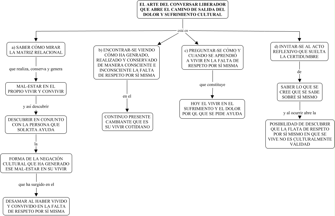 Este Cmap, tiene información relacionada con: EL ARTE DEL CONVERSAR LIBERADOR, EL ARTE DEL CONVERSAR LIBERADOR QUE ABRE EL CAMINO DE SALIDA DEL DOLOR Y SUFRIMIENTO CULTURAL está en c) PREGUNTAR-SE CÓMO Y CUANDO SE APRENDIÓ A VIVIR EN LA FALTA DE RESPETO POR SÍ MISMA, SABER LO QUE SE CREE QUE SE SABE SOBRE SÍ MISMO y al ocurrir abre la POSIBILIDAD DE DESCUBRIR QUE LA FLATA DE RESPETO POR SÍ MISMO EN QUE SE VIVE NO ES CULTURALMENTE VÁLIDAD, b) ENCONTRAR-SE VIENDO CÓMO HA GENRADO, REALIZADO Y CONSERVADO DE MANERA CONSCIENTE E INCONSCIENTE LA FALTA DE RESPETO POR SÍ MISMA en el CONTINUO PRESENTE CAMBIANTE QUE ES SU VIVIR COTIDIANO, FORMA DE LA NEGACIÓN CULTURAL QUE HA GENERADO ESE MAL-ESTAR EN SU VIVIR que ha surgido en el DESAMAR AL HABER VIVIDO Y CONVIVIDO EN LA FALTA DE RESPETO POR SÍ MISMA, a) SABER CÓMO MIRAR LA MATRIZ RELACIONAL que realiza, conserva y genera MAL-ESTAR EN EL PROPIO VIVIR Y CONVIVIR, EL ARTE DEL CONVERSAR LIBERADOR QUE ABRE EL CAMINO DE SALIDA DEL DOLOR Y SUFRIMIENTO CULTURAL está en b) ENCONTRAR-SE VIENDO CÓMO HA GENRADO, REALIZADO Y CONSERVADO DE MANERA CONSCIENTE E INCONSCIENTE LA FALTA DE RESPETO POR SÍ MISMA, DESCUBRIR EN CONJUNTO CON LA PERSONA QUE SOLICITA AYUDA la FORMA DE LA NEGACIÓN CULTURAL QUE HA GENERADO ESE MAL-ESTAR EN SU VIVIR, EL ARTE DEL CONVERSAR LIBERADOR QUE ABRE EL CAMINO DE SALIDA DEL DOLOR Y SUFRIMIENTO CULTURAL está en a) SABER CÓMO MIRAR LA MATRIZ RELACIONAL, MAL-ESTAR EN EL PROPIO VIVIR Y CONVIVIR y así descubrir DESCUBRIR EN CONJUNTO CON LA PERSONA QUE SOLICITA AYUDA, d) INVITAR-SE AL ACTO REFLEXIVO QUE SUELTA LA CERTIDUMBRE de SABER LO QUE SE CREE QUE SE SABE SOBRE SÍ MISMO, EL ARTE DEL CONVERSAR LIBERADOR QUE ABRE EL CAMINO DE SALIDA DEL DOLOR Y SUFRIMIENTO CULTURAL está en d) INVITAR-SE AL ACTO REFLEXIVO QUE SUELTA LA CERTIDUMBRE, c) PREGUNTAR-SE CÓMO Y CUANDO SE APRENDIÓ A VIVIR EN LA FALTA DE RESPETO POR SÍ MISMA que constituye HOY EL VIVIR EN EL SUFRIMIENTO Y EL DOLOR POR QL QUE SE PIDE AYUDA