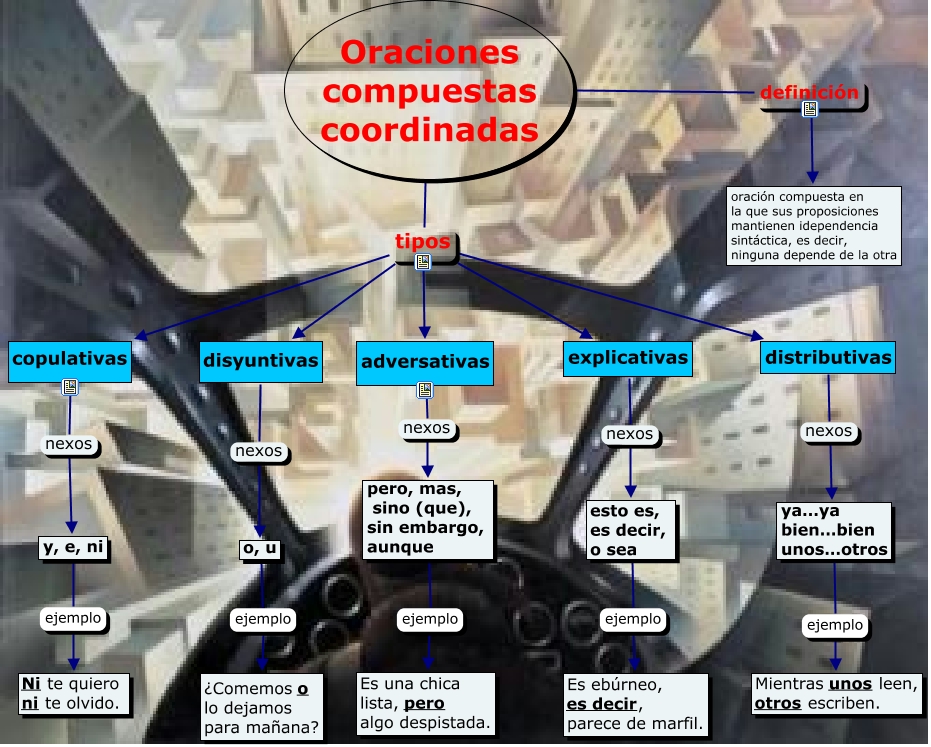 Este Cmap, tiene información relacionada con: Oraciones coordinadas, adversativas nexos pero, mas, sino (que), sin embargo, aunque, Oraciones compuestas coordinadas tipos disyuntivas, disyuntivas nexos o, u, distributivas nexos ya…ya bien…bien unos…otros, Oraciones compuestas coordinadas tipos copulativas, explicativas nexos esto es, es decir, o sea, ya…ya bien…bien unos…otros ejemplo Mientras unos leen, otros escriben., o, u ejemplo ¿Comemos o lo dejamos para mañana?, Oraciones compuestas coordinadas definición oración compuesta en la que sus proposiciones mantienen idependencia sintáctica, es decir, ninguna depende de la otra, esto es, es decir, o sea ejemplo Es ebúrneo, es decir, parece de marfil., copulativas nexos y, e, ni, Oraciones compuestas coordinadas tipos distributivas, Oraciones compuestas coordinadas tipos adversativas, pero, mas, sino (que), sin embargo, aunque ejemplo Es una chica lista, pero algo despistada., Oraciones compuestas coordinadas tipos explicativas, y, e, ni ejemplo Ni te quiero ni te olvido.
