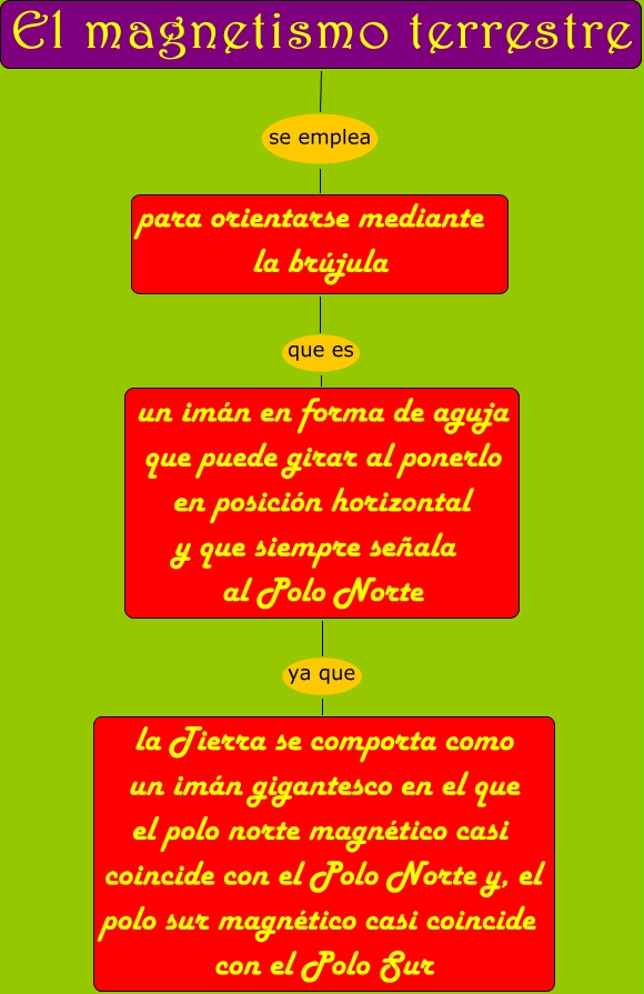 Este Cmap, tiene información relacionada con: El magnetismo terrestre, El magnetismo terrestre se emplea para orientarse mediante la brújula, para orientarse mediante la brújula que es un imán en forma de aguja que puede girar al ponerlo en posición horizontal y que siempre señala al Polo Norte, un imán en forma de aguja que puede girar al ponerlo en posición horizontal y que siempre señala al Polo Norte ya que la Tierra se comporta como un imán gigantesco en el que el polo norte magnético casi coincide con el Polo Norte y, el polo sur magnético casi coincide con el Polo Sur