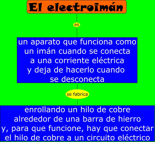 Este Cmap, tiene información relacionada con: El electroimán, El electroimán es un aparato que funciona como un imán cuando se conecta a una corriente eléctrica y deja de hacerlo cuando se desconecta, un aparato que funciona como un imán cuando se conecta a una corriente eléctrica y deja de hacerlo cuando se desconecta se fabrica enrollando un hilo de cobre alrededor de una barra de hierro y, para que funcione, hay que conectar el hilo de cobre a un circuito eléctrico