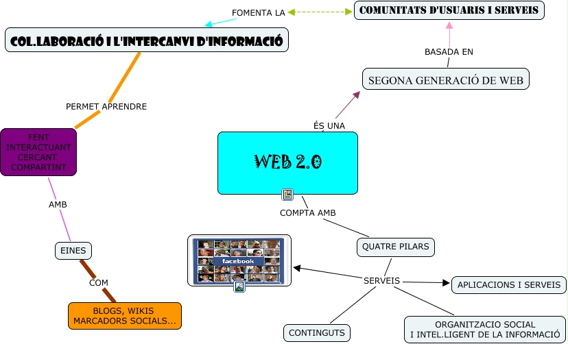 Aquest mapa conceptual conté informació relacionada amb: WEB 2, COL.LABORACIÓ I L'INTERCANVI D'INFORMACIÓ PERMET APRENDRE FENT INTERACTUANT CERCANT COMPARTINT, QUATRE PILARS SERVEIS, QUATRE PILARS SERVEIS CONTINGUTS, COMUNITATS D'USUARIS I SERVEIS FOMENTA LA COL.LABORACIÓ I L'INTERCANVI D'INFORMACIÓ, QUATRE PILARS SERVEIS APLICACIONS I SERVEIS, SEGONA GENERACIÓ DE WEB BASADA EN COMUNITATS D'USUARIS I SERVEIS, FENT INTERACTUANT CERCANT COMPARTINT AMB EINES, QUATRE PILARS SERVEIS ORGANITZACIO SOCIAL I INTEL.LIGENT DE LA INFORMACIÓ, WEB 2.0 COMPTA AMB QUATRE PILARS, EINES COM BLOGS, WIKIS MARCADORS SOCIALS..., WEB 2.0 ÉS UNA SEGONA GENERACIÓ DE WEB