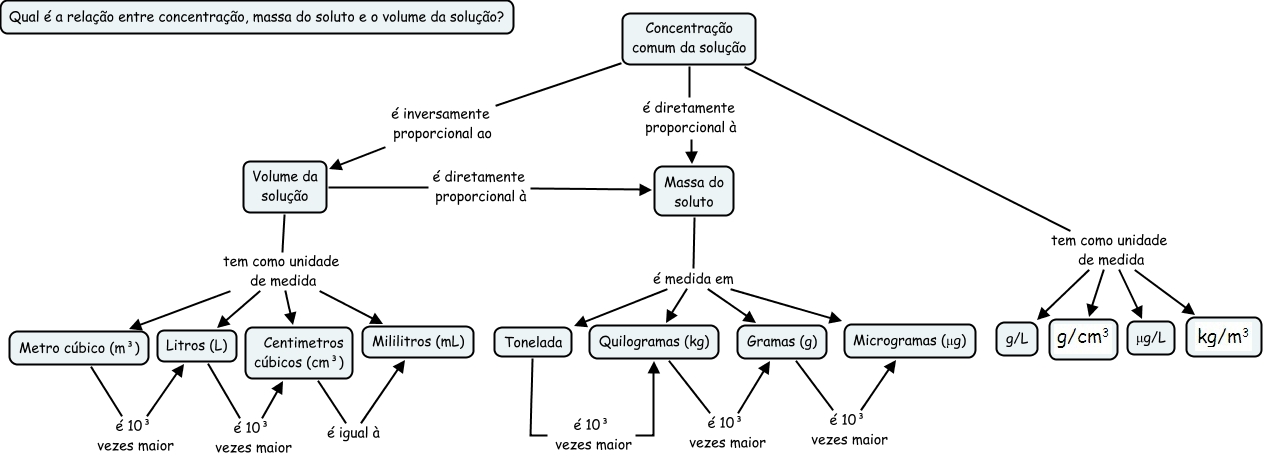 Esse mapa conceitual, produzido no IHMC CmapTools, tem a informação relacionada a: Concentração 2C, Volume da solução tem como unidade de medida Centimetros cúbicos (cm³), Volume da solução tem como unidade de medida Litros (L), Concentração comum da solução é diretamente proporcional à Massa do soluto, Concentração comum da solução é inversamente proporcional ao Volume da solução, Massa do soluto é medida em Tonelada, Volume da solução tem como unidade de medida Mililitros (mL), Litros (L) é 10³ vezes maior Centimetros cúbicos (cm³), Quilogramas (kg) é 10³ vezes maior Gramas (g), Concentração comum da solução tem como unidade de medida μg/L, Massa do soluto é medida em Gramas (g), Concentração comum da solução tem como unidade de medida, Massa do soluto é medida em Microgramas (μg), Tonelada é 10³ vezes maior Quilogramas (kg), Concentração comum da solução tem como unidade de medida g/L, Concentração comum da solução tem como unidade de medida, Volume da solução tem como unidade de medida Metro cúbico (m³), Metro cúbico (m³) é 10³ vezes maior Litros (L), Massa do soluto é medida em Quilogramas (kg), Centimetros cúbicos (cm³) é igual à Mililitros (mL), Gramas (g) é 10³ vezes maior Microgramas (μg)