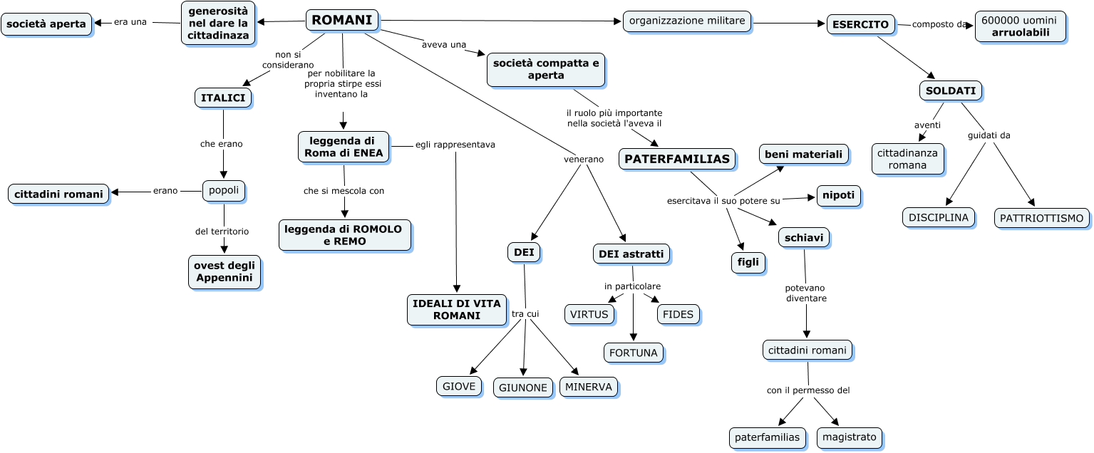 Questa Cmap, creata con IHMC CmapTools, contiene informazioni relative a: L'identità romana ( Mauro Ferrari), PATERFAMILIAS esercitava il suo potere su schiavi, cittadini romani con il permesso del magistrato, ROMANI per nobilitare la propria stirpe essi inventano la leggenda di Roma di ENEA, DEI tra cui GIOVE, schiavi potevano diventare cittadini romani, PATERFAMILIAS esercitava il suo potere su beni materiali, ESERCITO SOLDATI, popoli erano cittadini romani, SOLDATI aventi cittadinanza romana, ROMANI organizzazione militare, popoli del territorio ovest degli Appennini, generosità nel dare la cittadinaza era una società aperta, ROMANI venerano DEI astratti, SOLDATI guidati da DISCIPLINA, PATERFAMILIAS esercitava il suo potere su nipoti, DEI astratti in particolare VIRTUS, SOLDATI guidati da PATTRIOTTISMO, DEI astratti in particolare FORTUNA, DEI astratti in particolare FIDES, società compatta e aperta il ruolo più importante nella società l'aveva il PATERFAMILIAS
