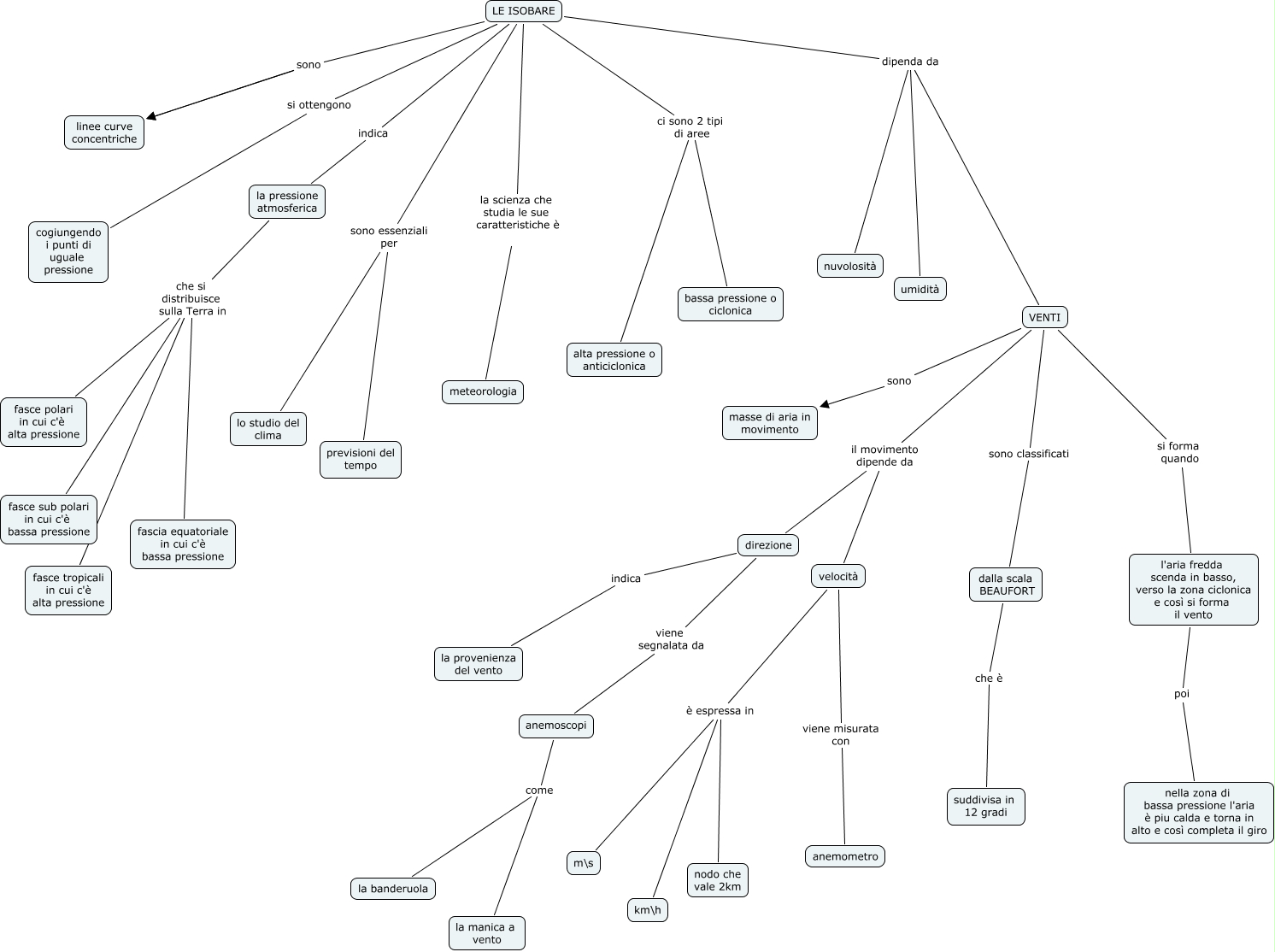 Questa Cmap, creata con IHMC CmapTools, contiene informazioni relative a: isobare e i venti ERI, LE ISOBARE ci sono 2 tipi di aree bassa pressione o ciclonica, VENTI sono classificati dalla scala BEAUFORT, la pressione atmosferica che si distribuisce sulla Terra in fasce polari in cui c'è alta pressione, LE ISOBARE ci sono 2 tipi di aree alta pressione o anticiclonica, dalla scala BEAUFORT che è suddivisa in 12 gradi, velocità è espressa in m\s, LE ISOBARE si ottengono cogiungendo i punti di uguale pressione, LE ISOBARE sono essenziali per previsioni del tempo, VENTI il movimento dipende da direzione, VENTI sono masse di aria in movimento, velocità viene misurata con anemometro, LE ISOBARE la scienza che studia le sue caratteristiche è meteorologia, LE ISOBARE sono essenziali per lo studio del clima, LE ISOBARE sono linee curve concentriche, LE ISOBARE dipenda da umidità, LE ISOBARE indica la pressione atmosferica, la pressione atmosferica che si distribuisce sulla Terra in fascia equatoriale in cui c'è bassa pressione, l'aria fredda scenda in basso, verso la zona ciclonica e così si forma il vento poi nella zona di bassa pressione l'aria è piu calda e torna in alto e così completa il giro, la pressione atmosferica che si distribuisce sulla Terra in fasce tropicali in cui c'è alta pressione, LE ISOBARE dipenda da VENTI
