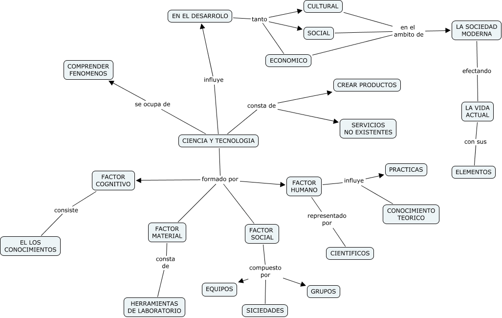 Este Cmap, tiene información relacionada con: LINA FLOREZ DAZA, FACTOR SOCIAL compuesto por GRUPOS, CIENCIA Y TECNOLOGIA influye EN EL DESARROLO, FACTOR MATERIAL consta de HERRAMIENTAS DE LABORATORIO, CULTURAL en el ambito de LA SOCIEDAD MODERNA, CIENCIA Y TECNOLOGIA consta de CREAR PRODUCTOS, CIENCIA Y TECNOLOGIA formado por FACTOR MATERIAL, CIENCIA Y TECNOLOGIA formado por FACTOR SOCIAL, EN EL DESARROLO tanto ECONOMICO, FACTOR SOCIAL compuesto por EQUIPOS, FACTOR COGNITIVO consiste EL LOS CONOCIMIENTOS, LA SOCIEDAD MODERNA efectando LA VIDA ACTUAL, FACTOR HUMANO influye PRACTICAS, EN EL DESARROLO tanto SOCIAL, LA VIDA ACTUAL con sus ELEMENTOS, ECONOMICO en el ambito de LA SOCIEDAD MODERNA, FACTOR HUMANO representado por CIENTIFICOS, SOCIAL en el ambito de LA SOCIEDAD MODERNA, FACTOR HUMANO influye CONOCIMIENTO TEORICO, EN EL DESARROLO tanto CULTURAL, CIENCIA Y TECNOLOGIA formado por FACTOR HUMANO